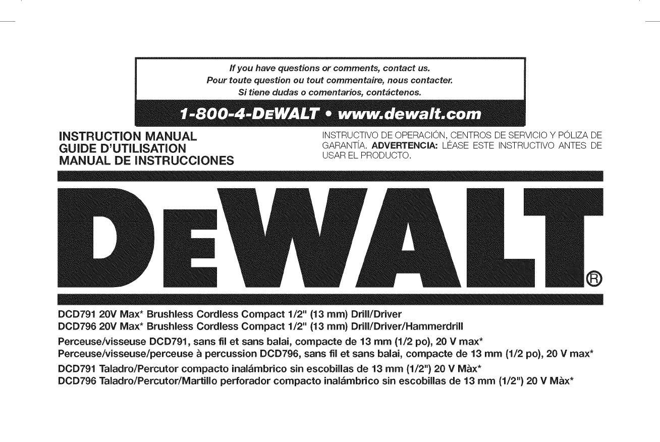 User Manual: Dewalt DCD791B TYPE 1 DCD791B TYPE 1 DEWALT CORDLESS DRILL - Manuals and Guides View the owners manual for your DEWALT CORDLESS DRILL #DCD791BTYPE1. Home:Tool Parts:Dewalt Parts:Dewalt CORDLESS DRILL Manual