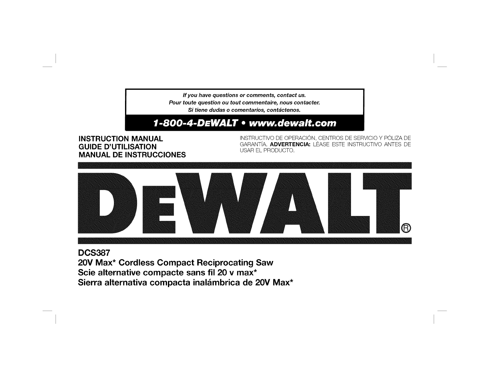 User Manual: Dewalt DCS387B TYPE 1 DCS387B TYPE 1 DEWALT 20V RECIPROCATING SAW - Manuals and Guides View the owners manual for your DEWALT 20V RECIPROCATING SAW #DCS387BTYPE1. Home:Tool Parts:Dewalt Parts:Dewalt 20V RECIPROCATING SAW Manual