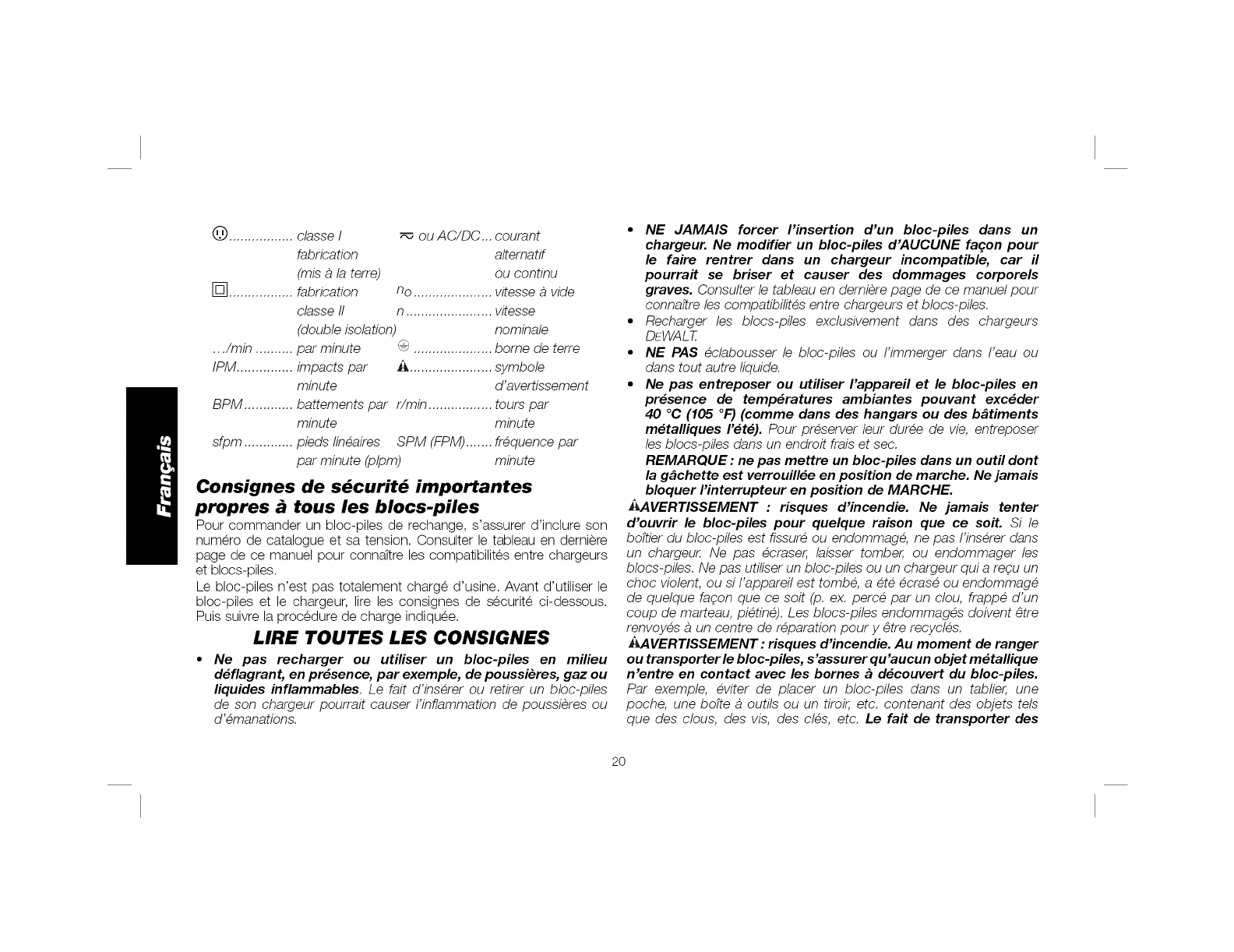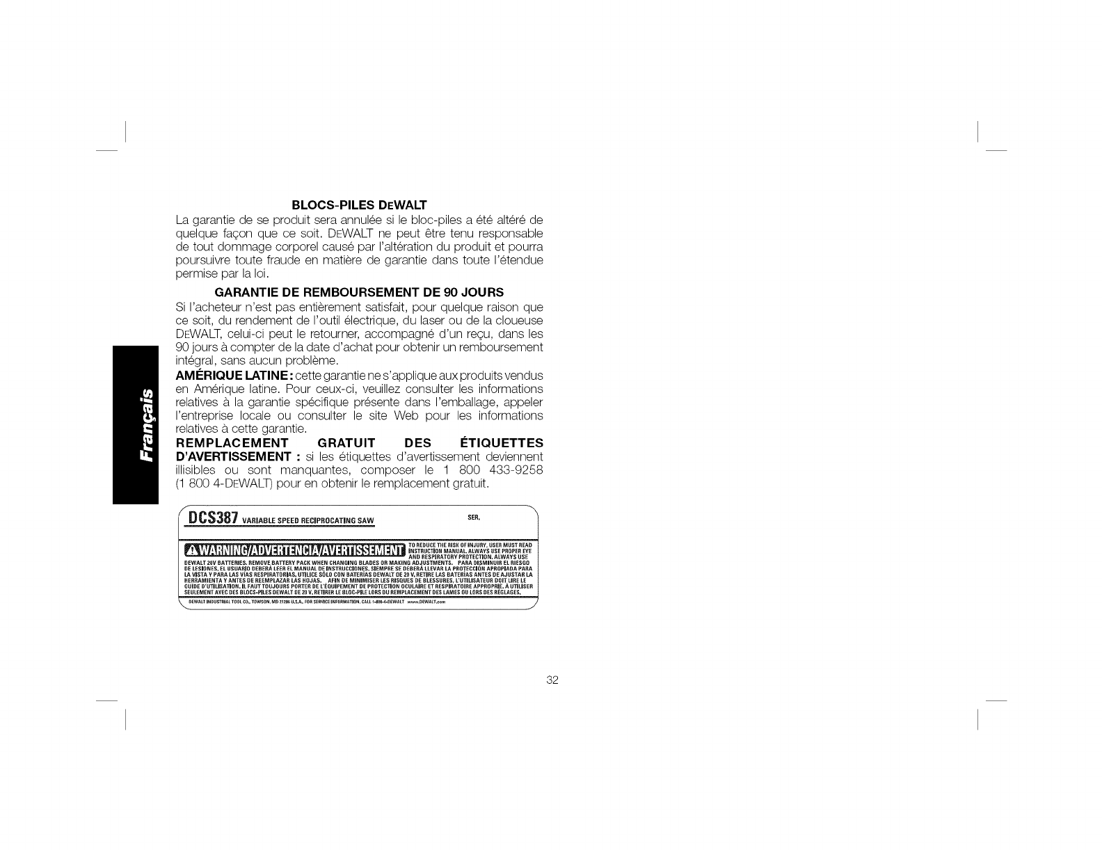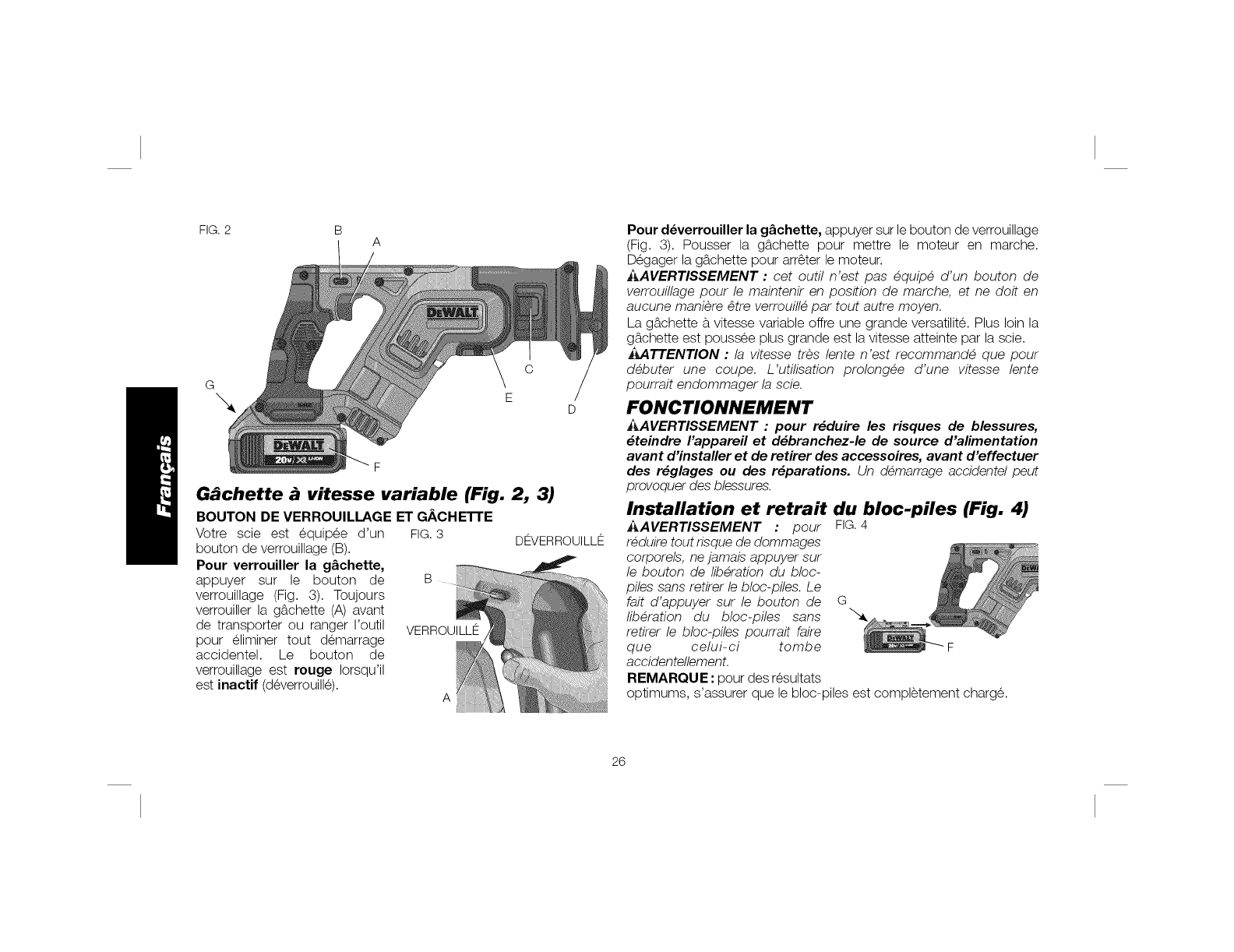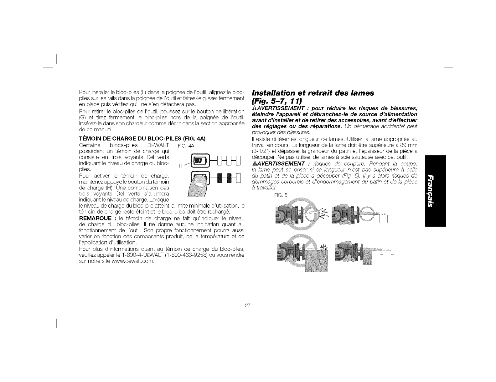 SEtlLEMENT ANEC DES BLOCS-PILES OEWALT DE EO R. RETJRER LE OLOC-PJLE LORS DU REMPLACEMENT DES LAMES UU LOSS OES R_GLAGES.