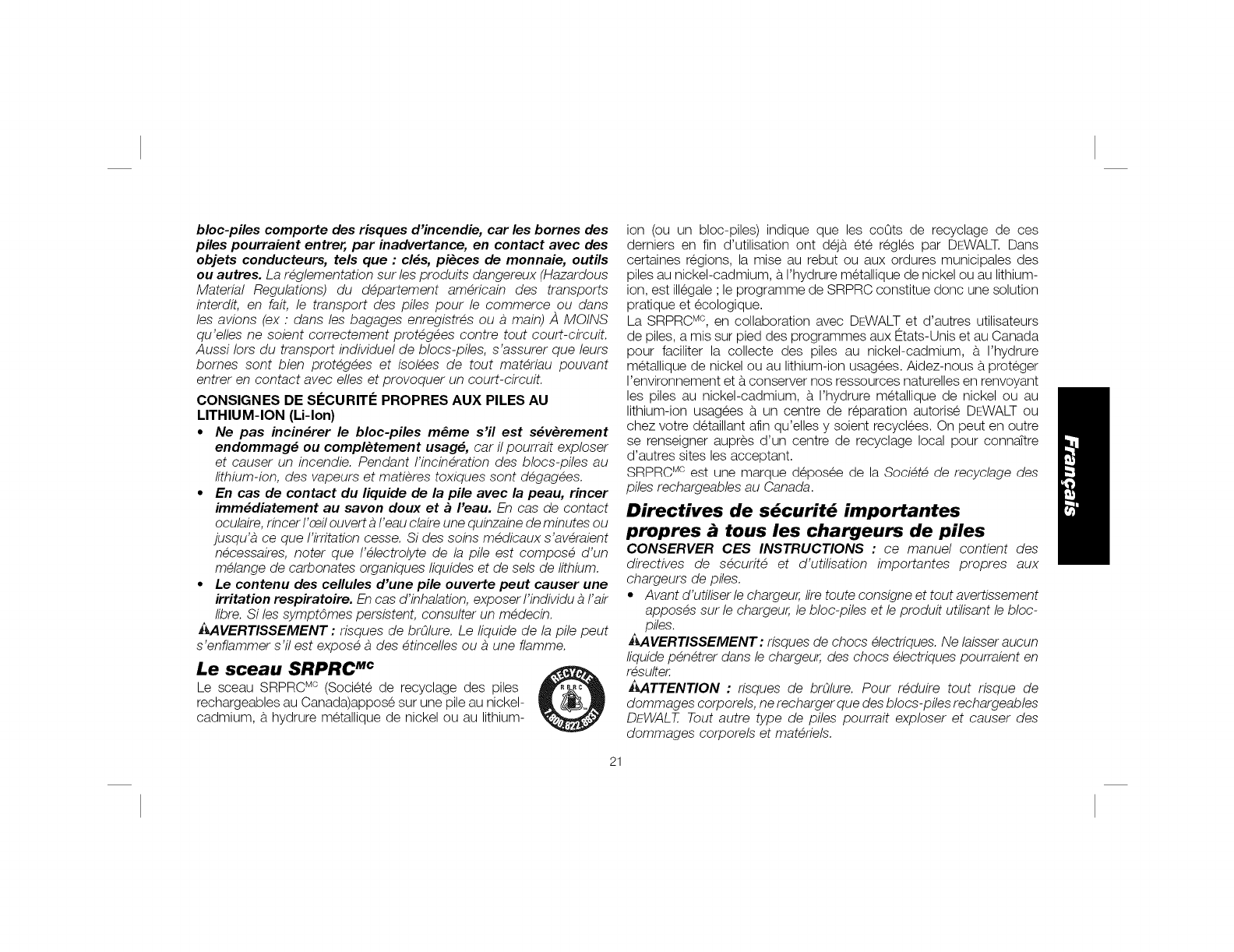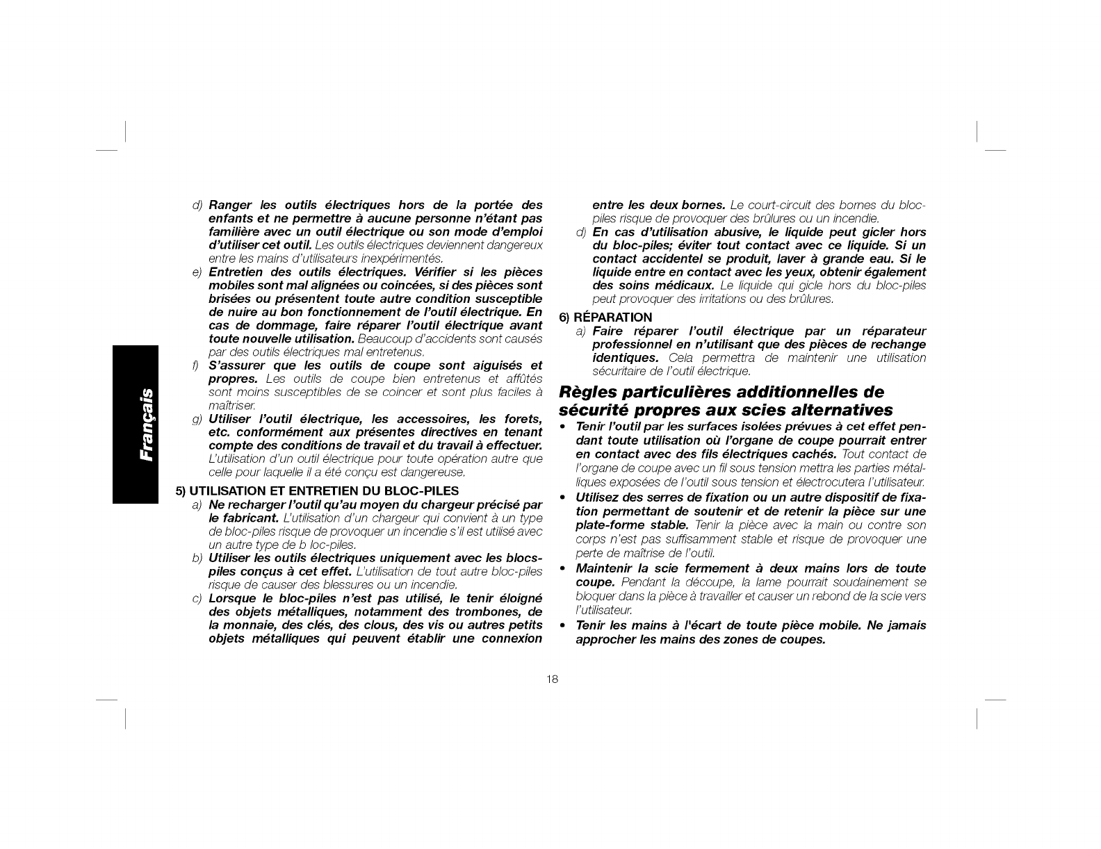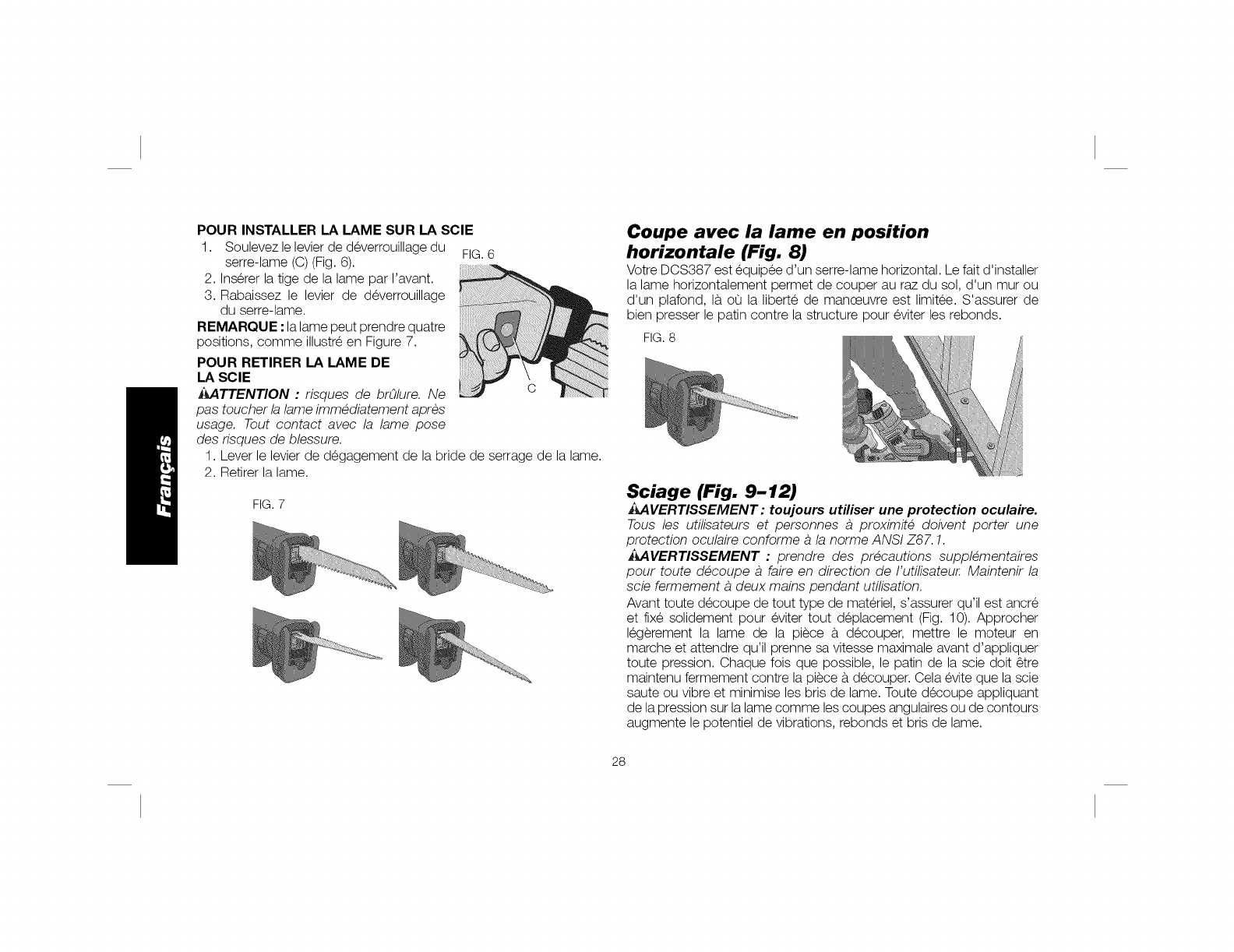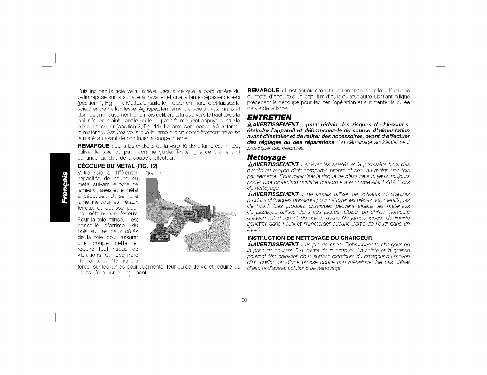 SEtlLEMENT ANEC DES BLOCS-PILES OEWALT DE EO R. RETJRER LE OLOC-PJLE LORS DU REMPLACEMENT DES LAMES UU LOSS OES R_GLAGES.