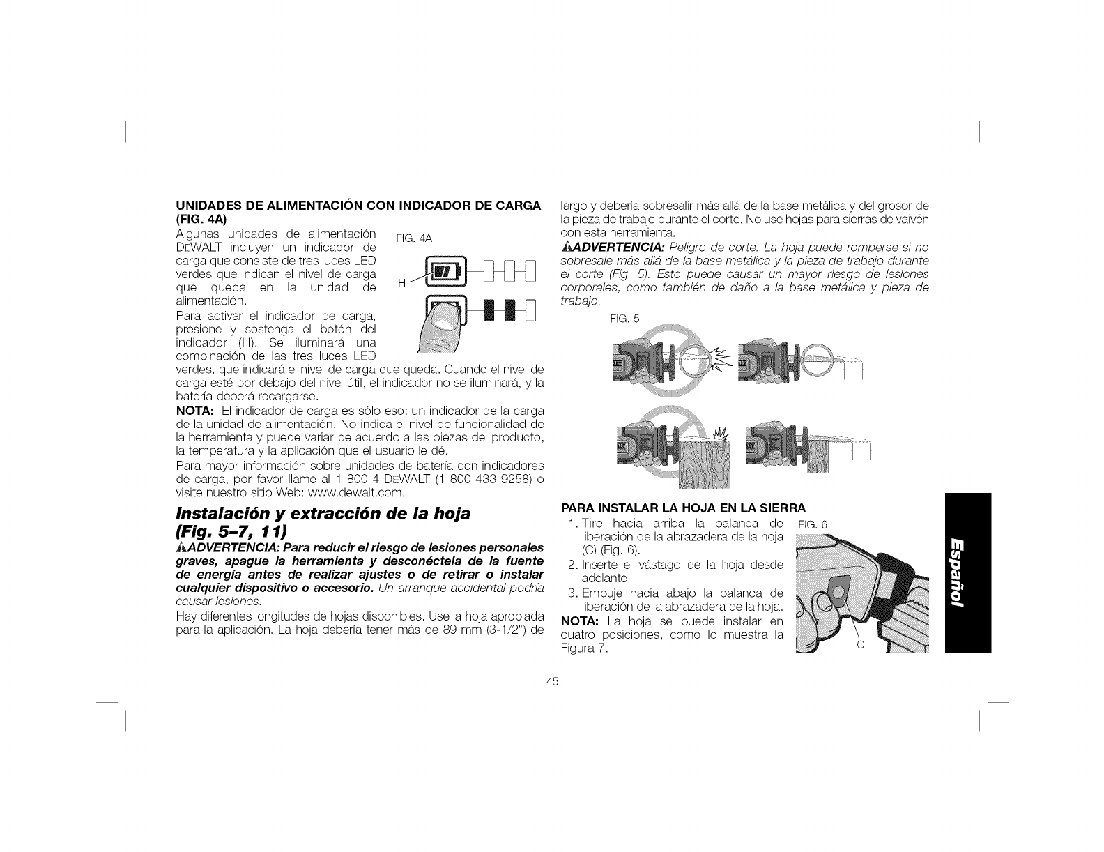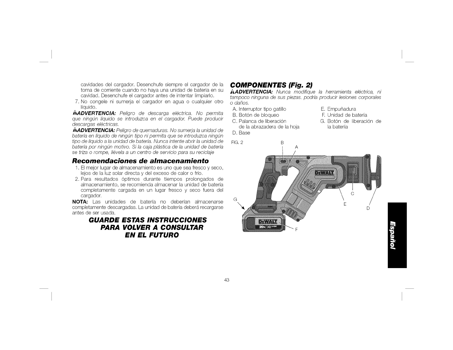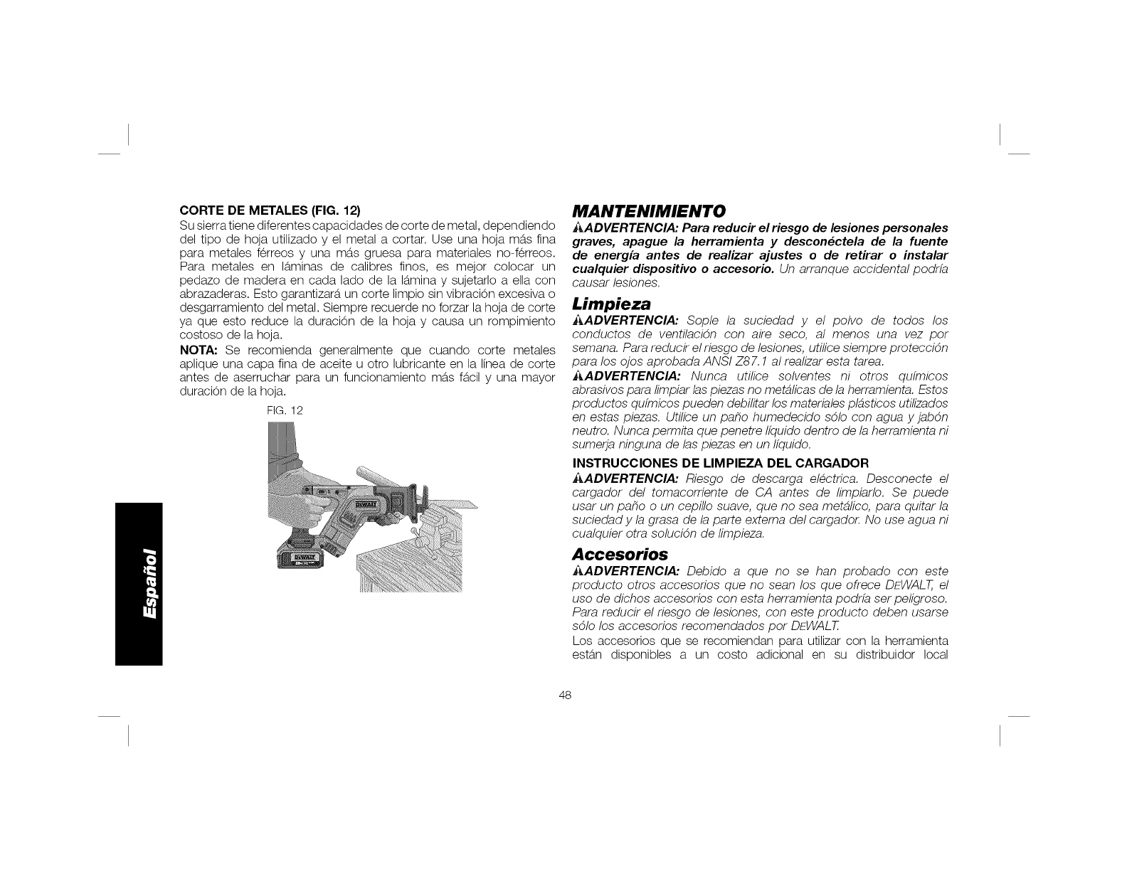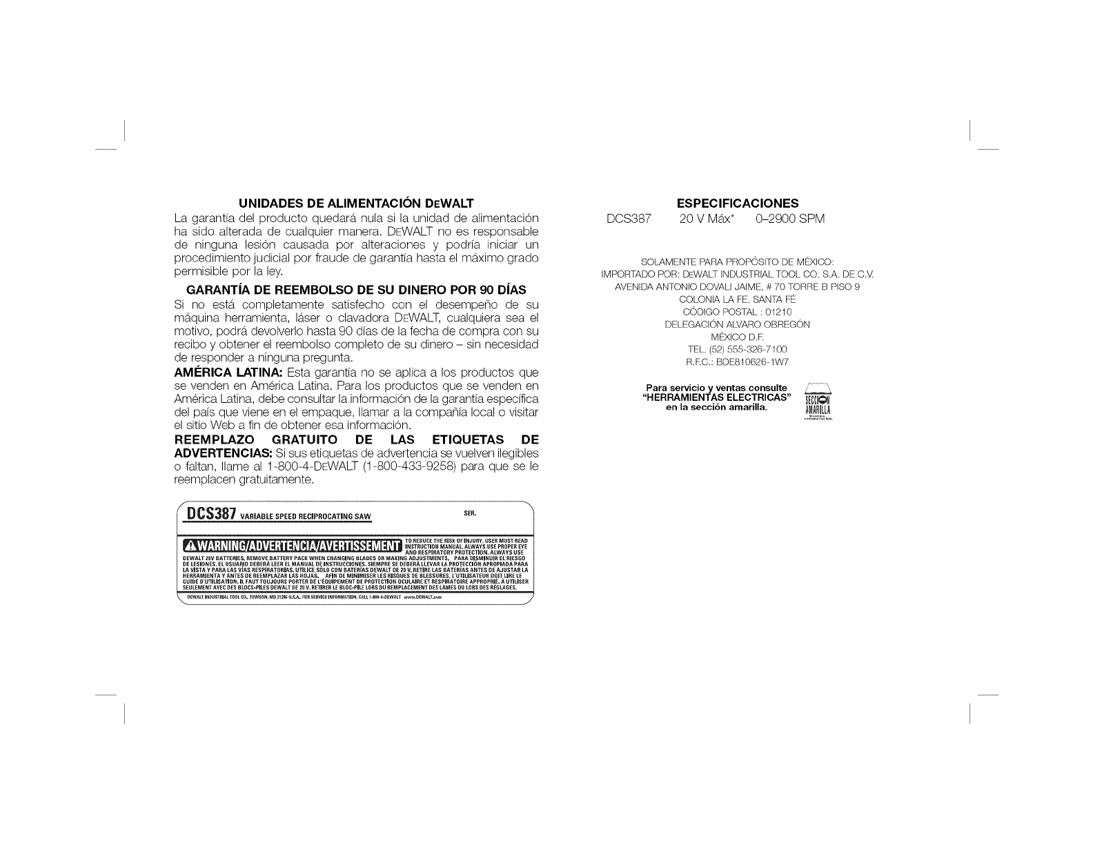 OEWALT 2or BATTERIES, REMOVE BATTERY PACN WHEN CHANGING BLADES OR MAKING ADJUSTMENTS. PAOA DISMBNUIR EL RIGRG 0
