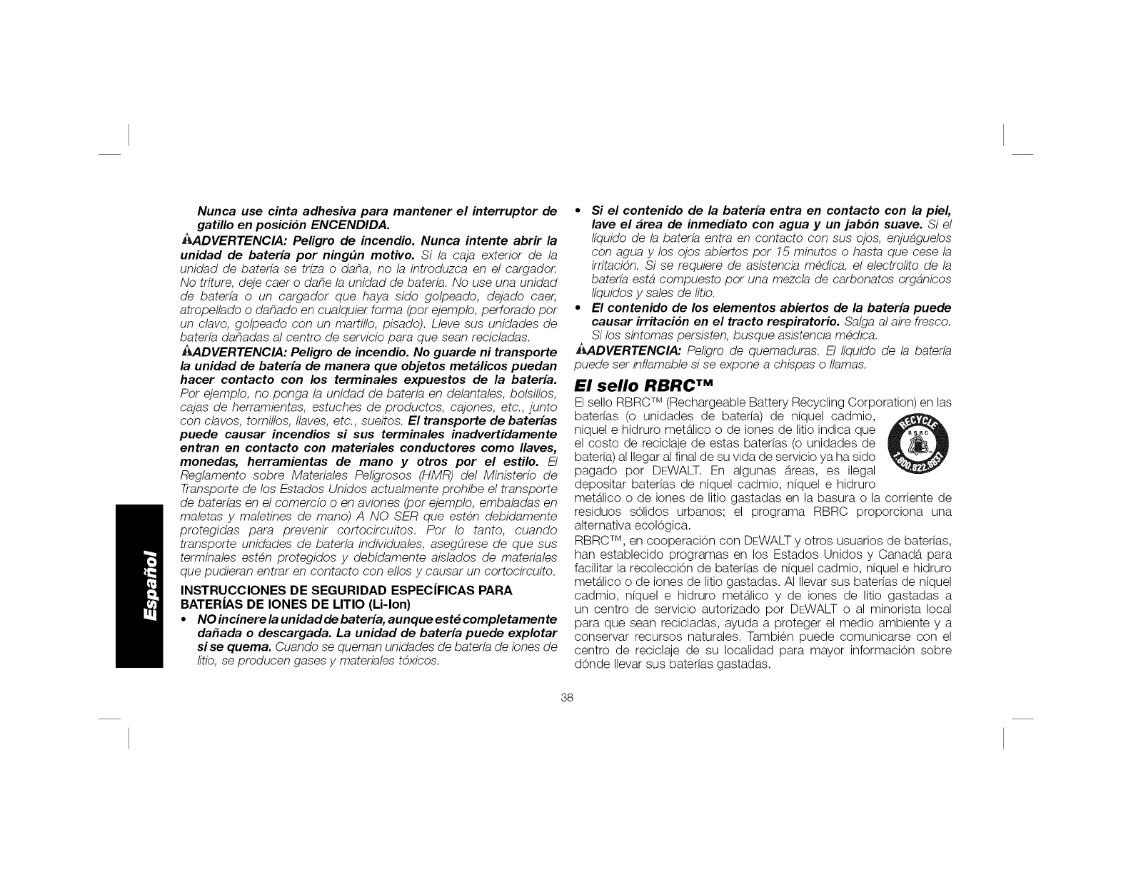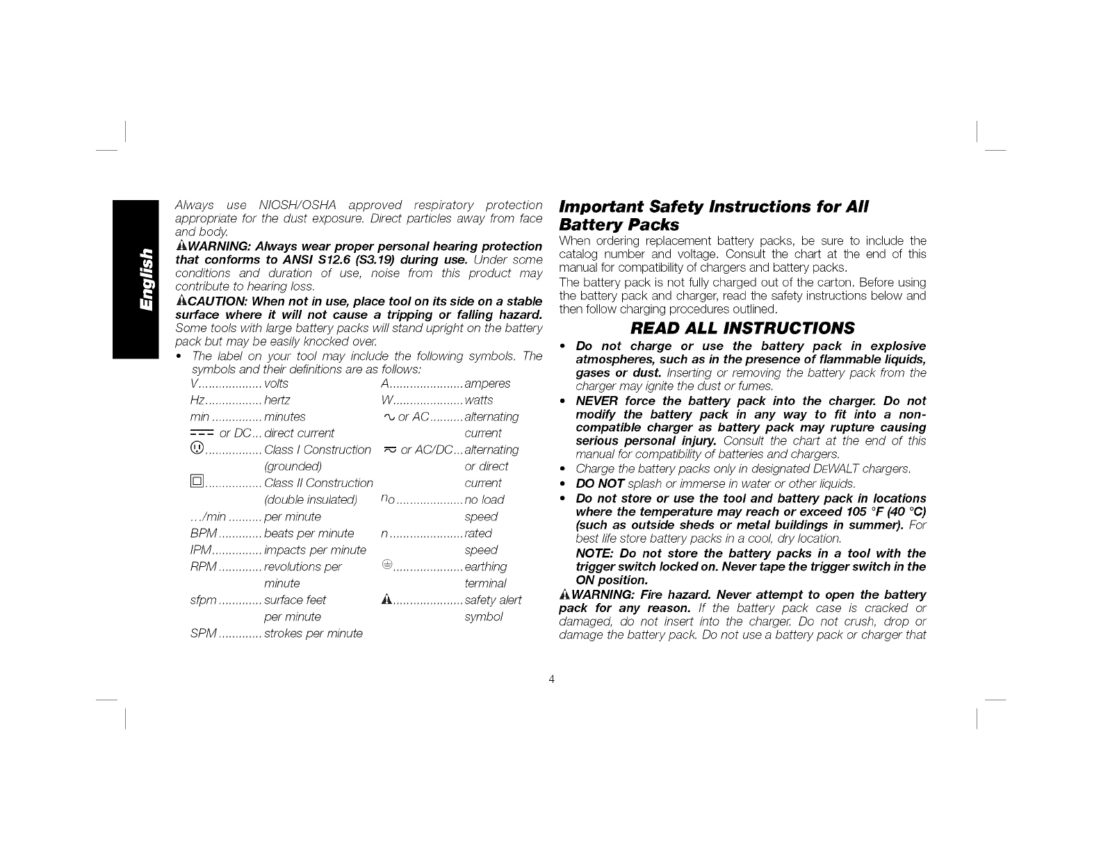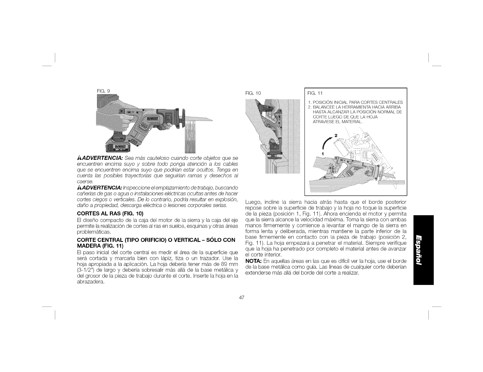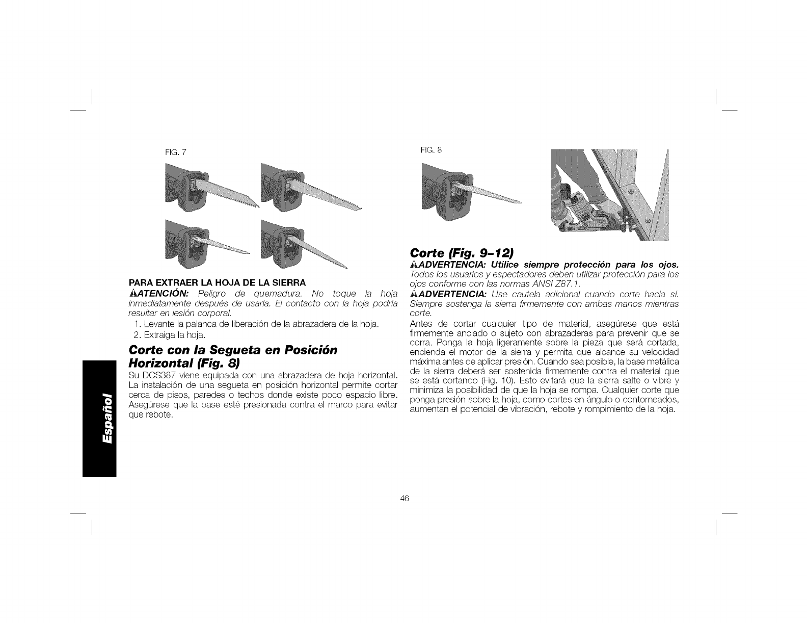OEWALT 2or BATTERIES, REMOVE BATTERY PACN WHEN CHANGING BLADES OR MAKING ADJUSTMENTS. PAOA DISMBNUIR EL RIGRG 0