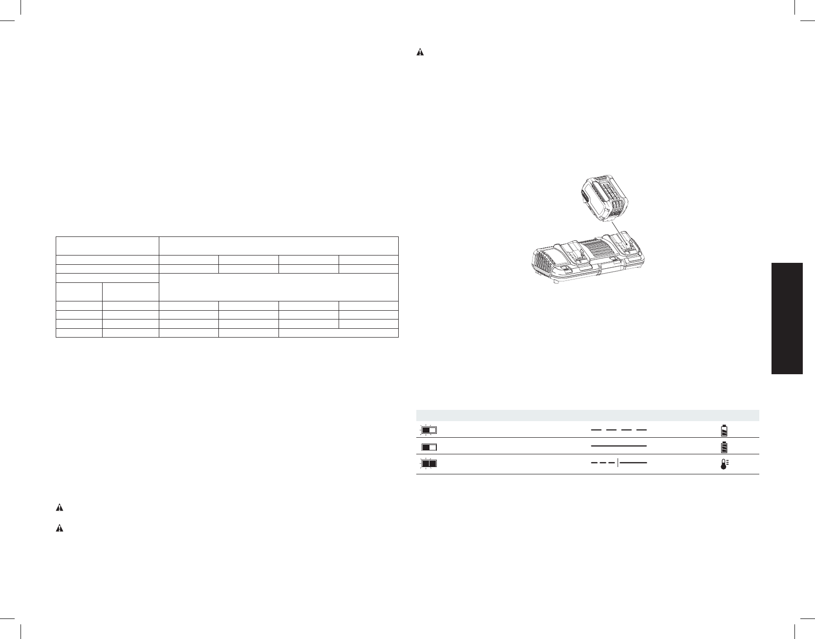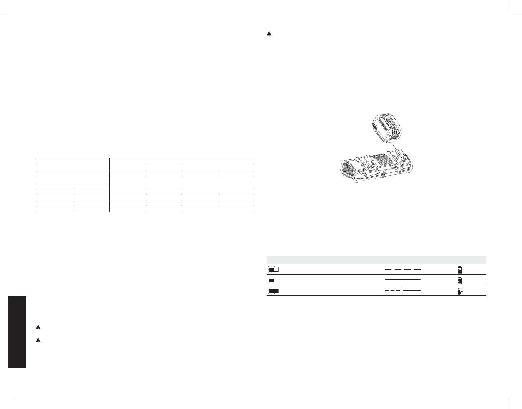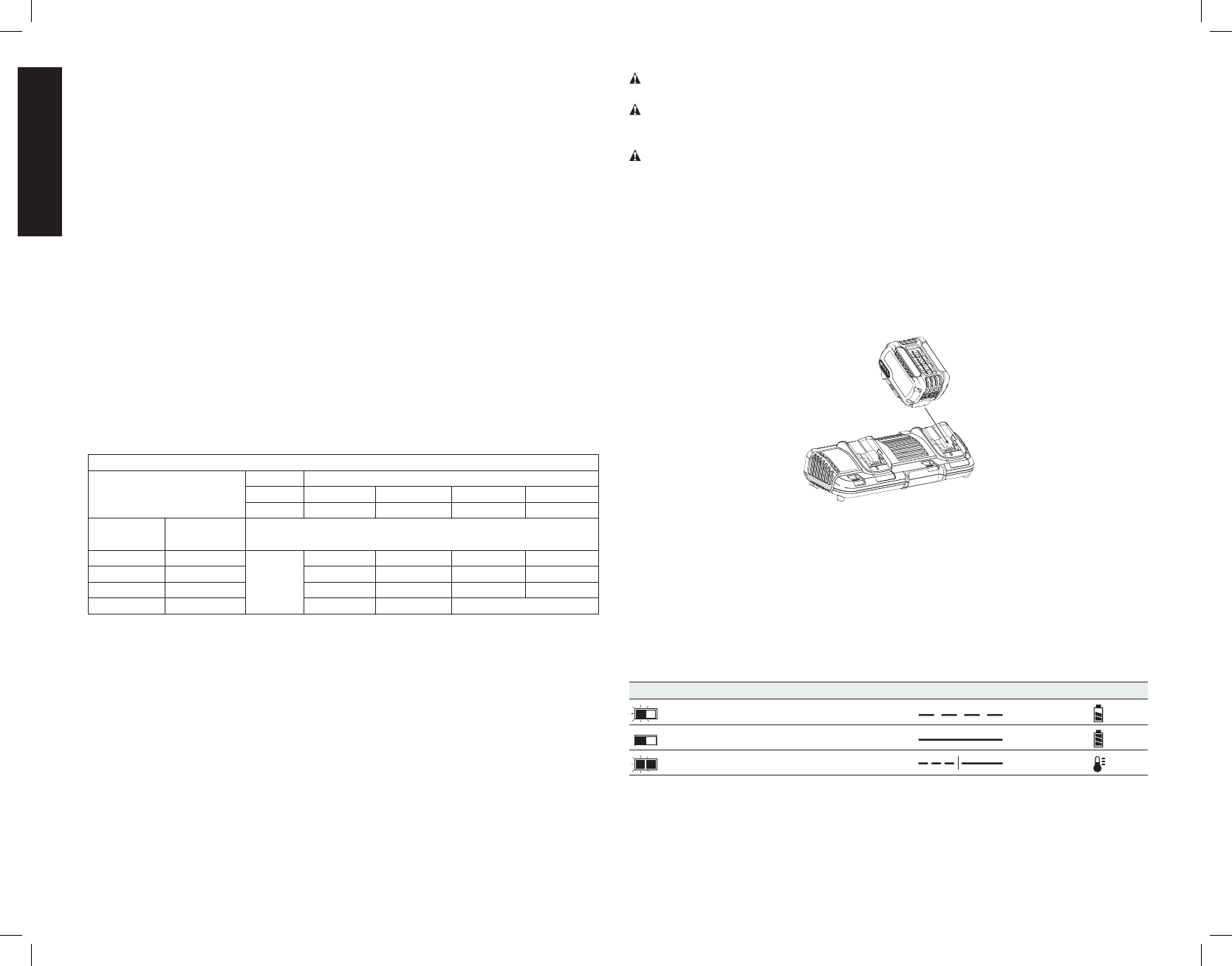 “X” indique que le bloc-piles n’est pas compatible avec ce chargeur. Les durées de charge sont approximatives; la durée de charge rélle peut varier. Lire le manuel d’utilisation pour obtenir des renseignements plus précis.