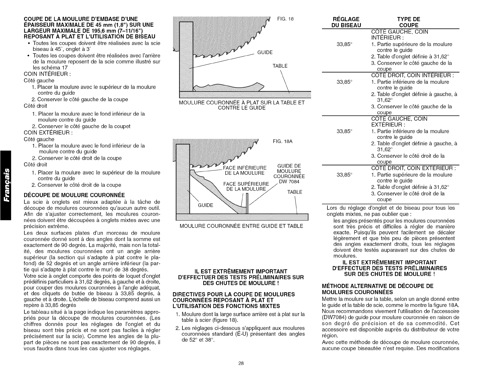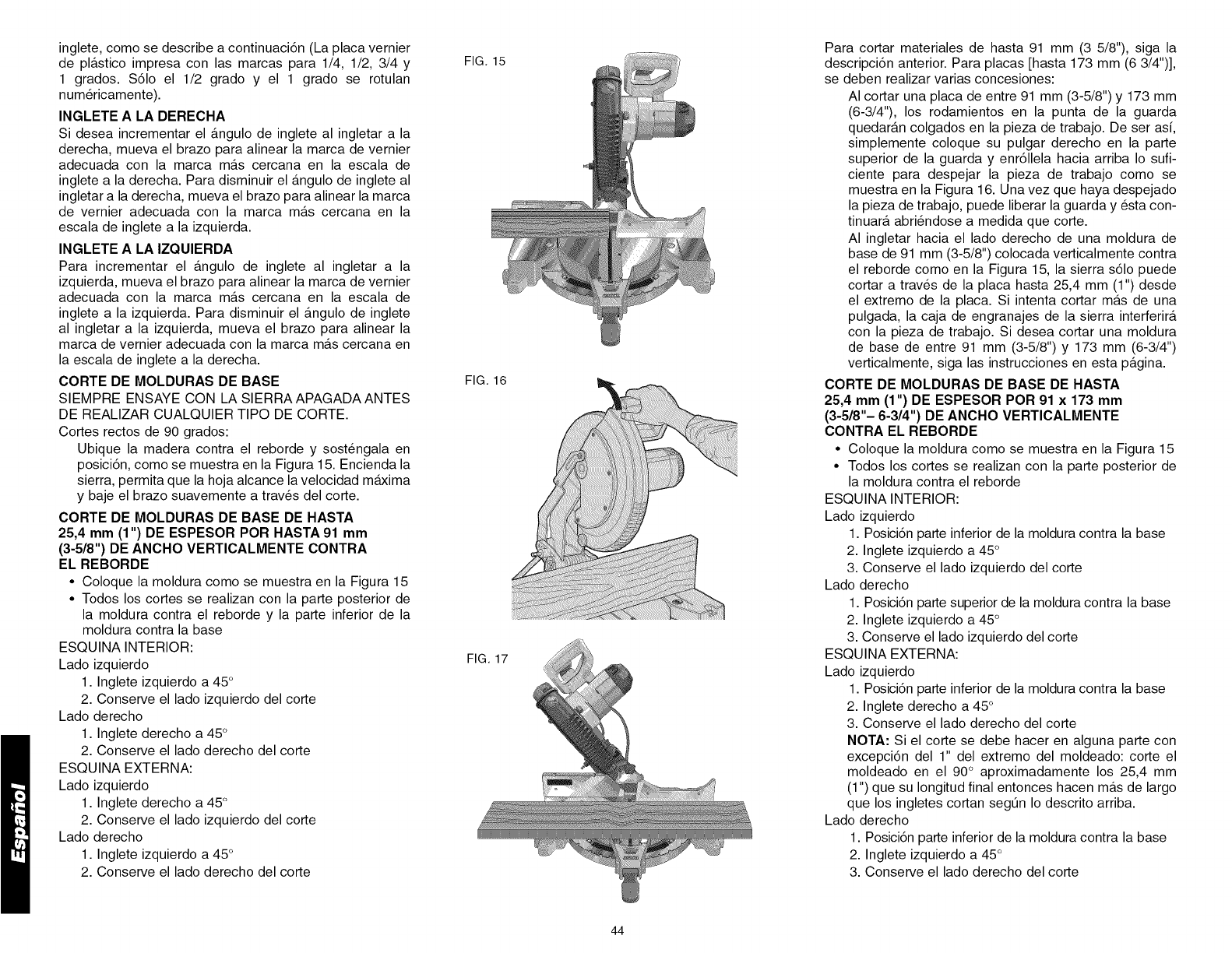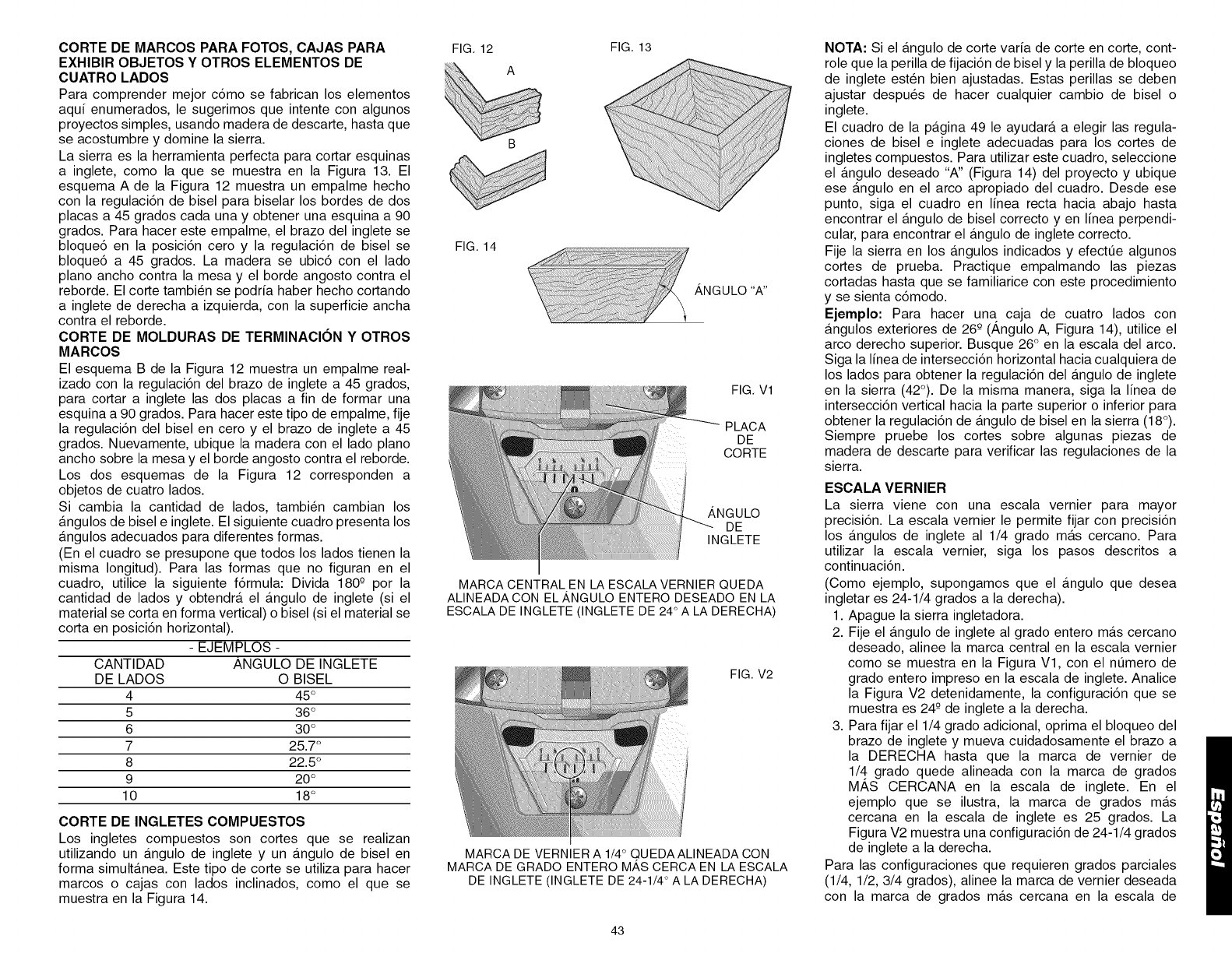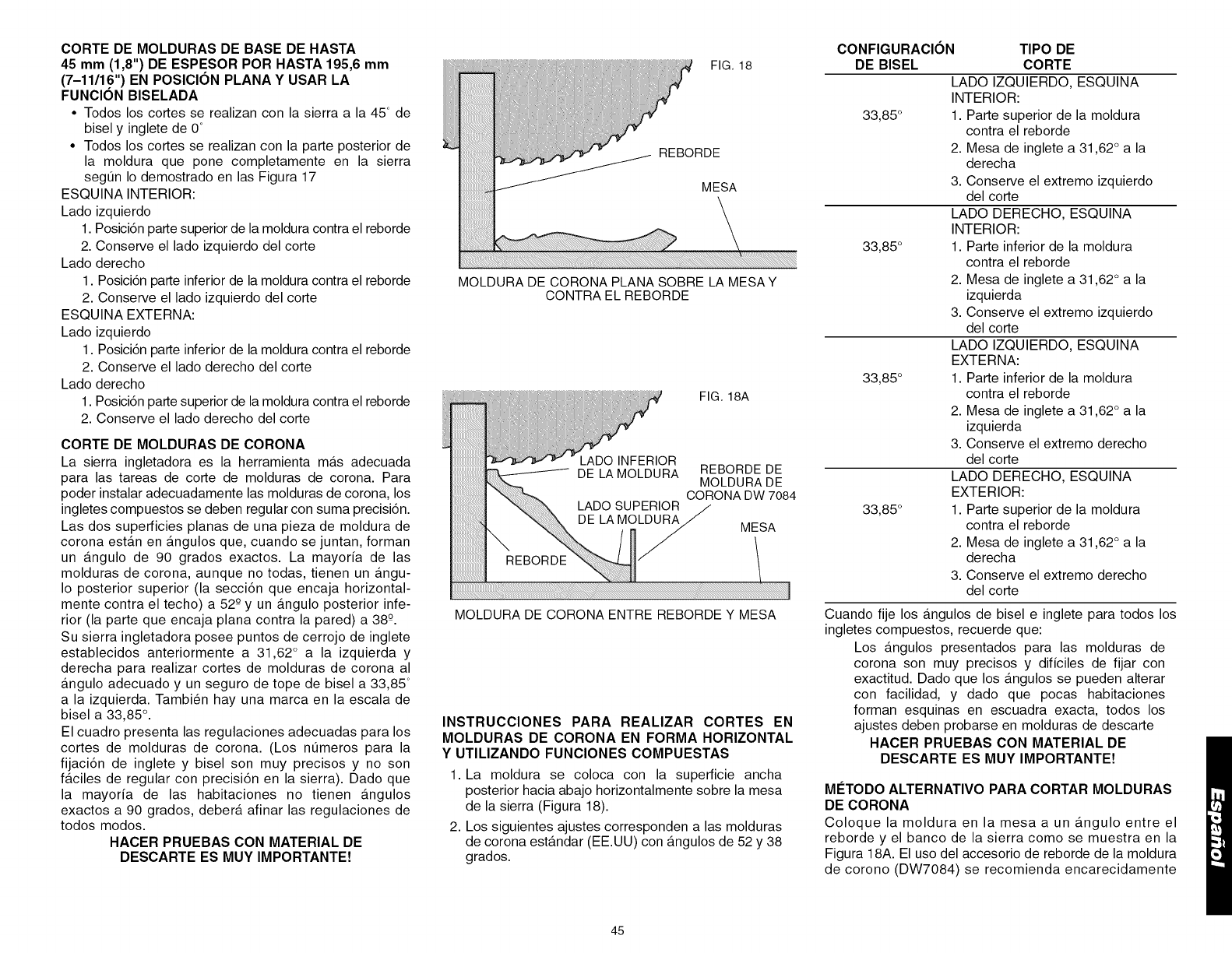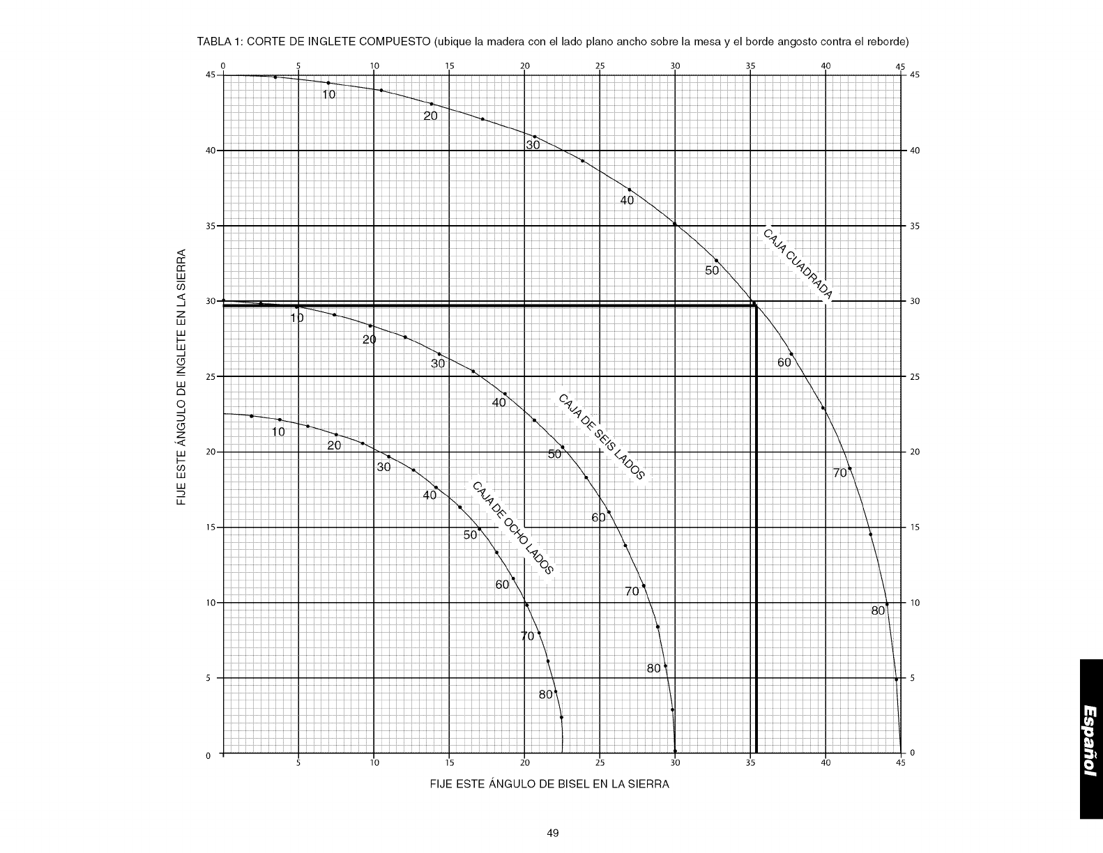 TABLA 1: CORTE DE INGLETE COMPUESTO (ubique la madera con el lado piano ancho sobre la mesa y el borde angosto contra el reborde)
