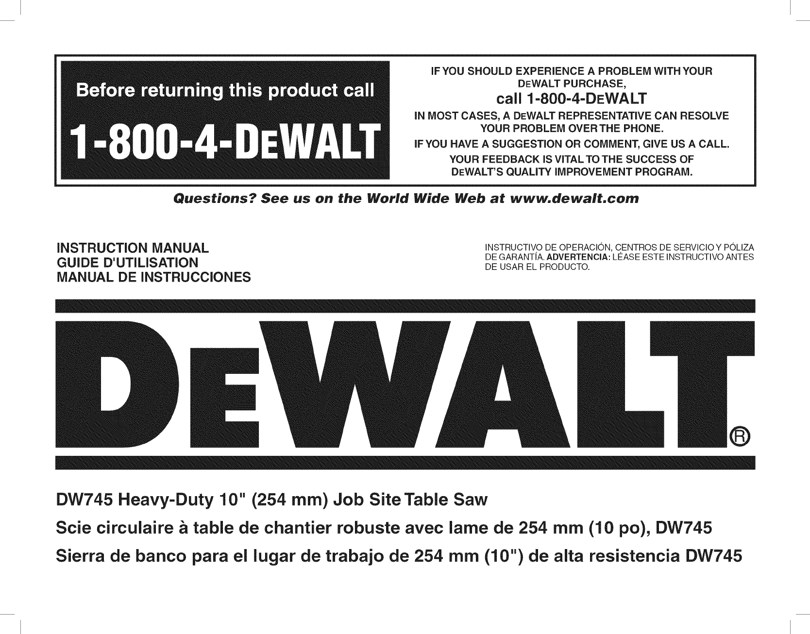 User Manual: Dewalt DW745 TYPE 1 DW745 TYPE 1 DEWALT TABLE SAW - Manuals and Guides View the owners manual for your DEWALT TABLE SAW #DW745TYPE1. Home:Tool Parts:Dewalt Parts:Dewalt TABLE SAW Manual
