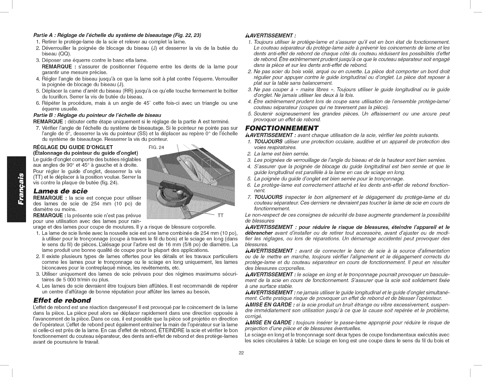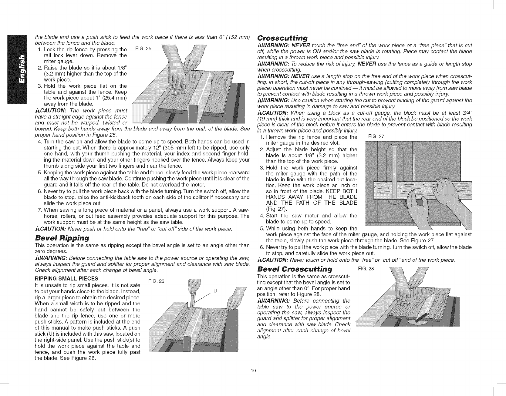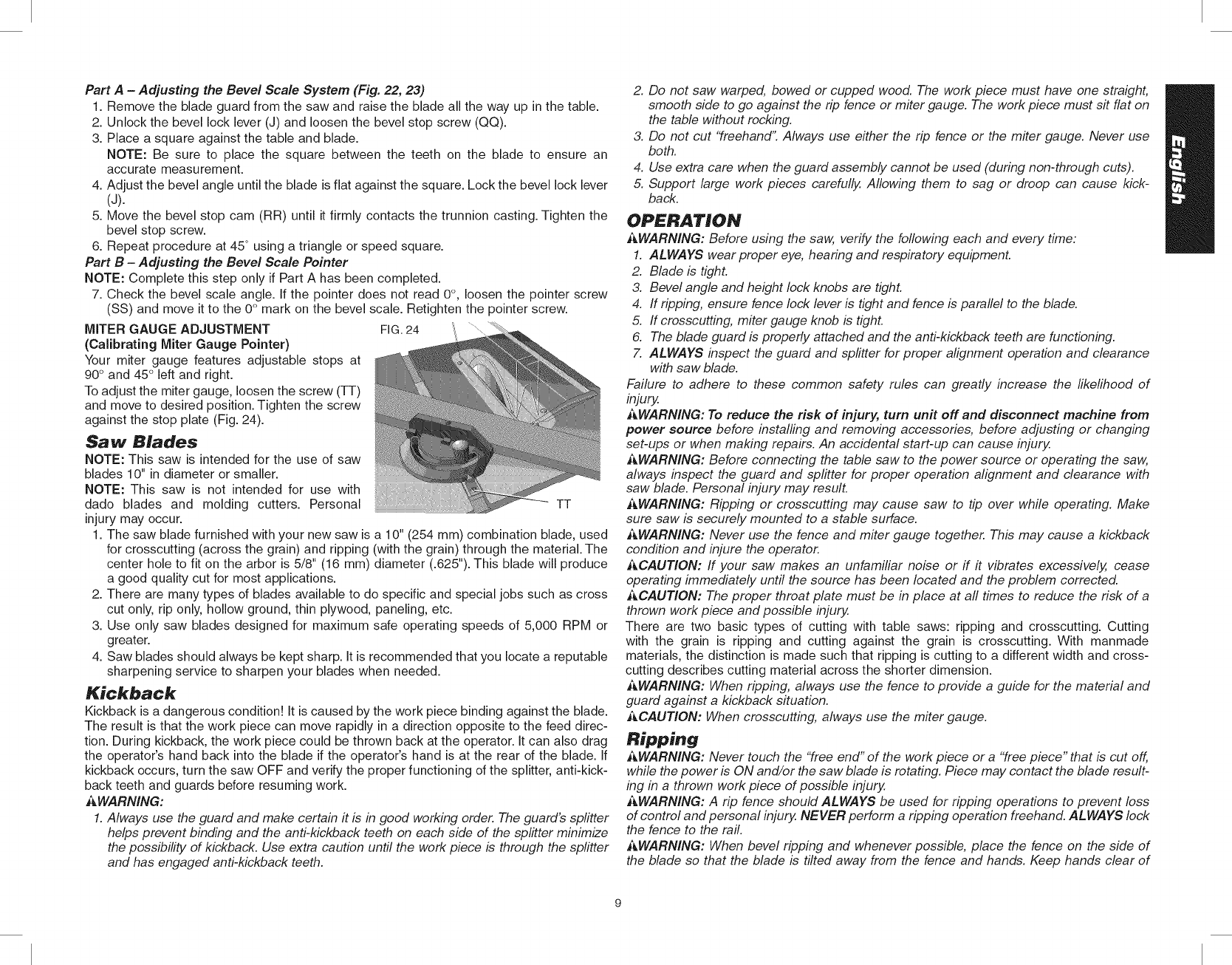 CAUTION WHEN BEVELING. USE SAW-BLADE GUARDAND SPLITTER FOREVERY OPERATION