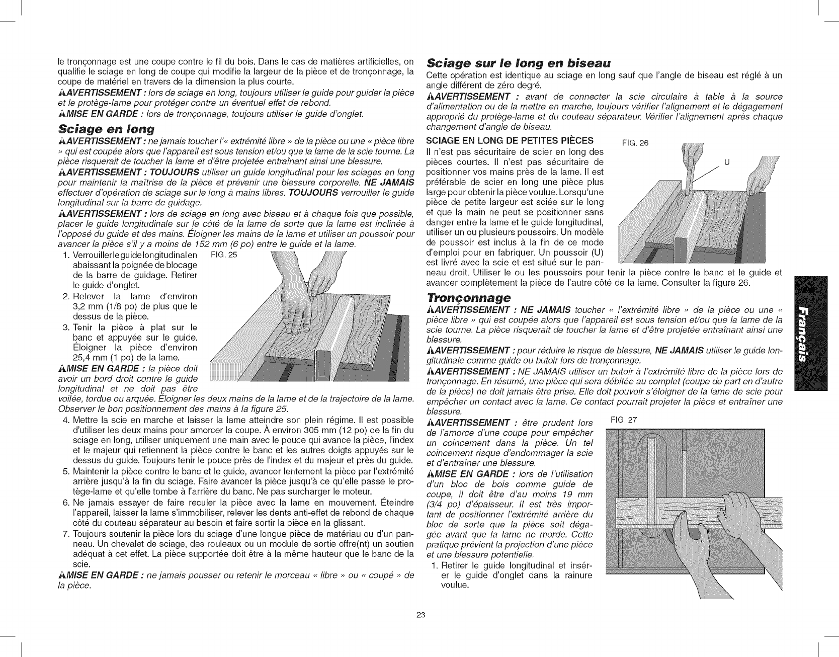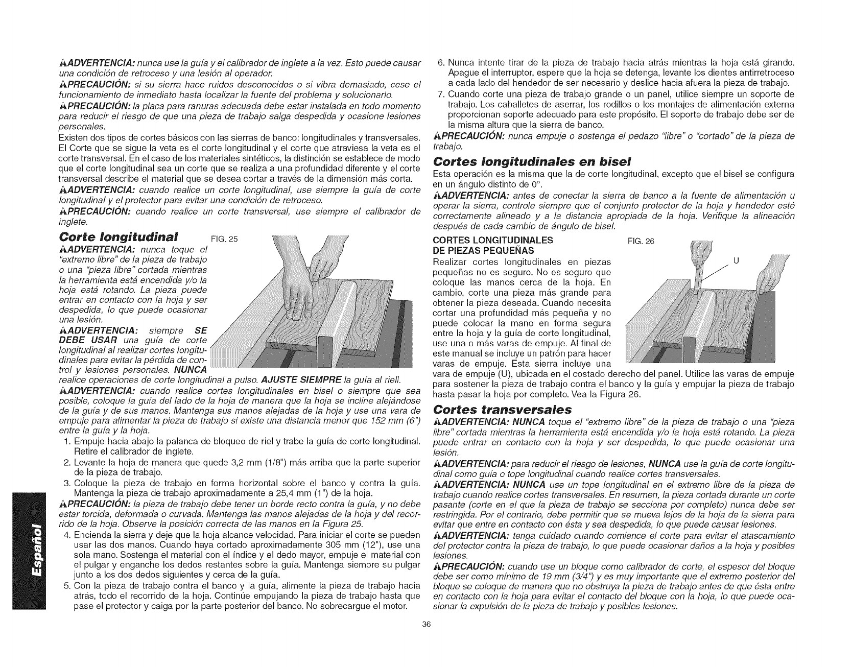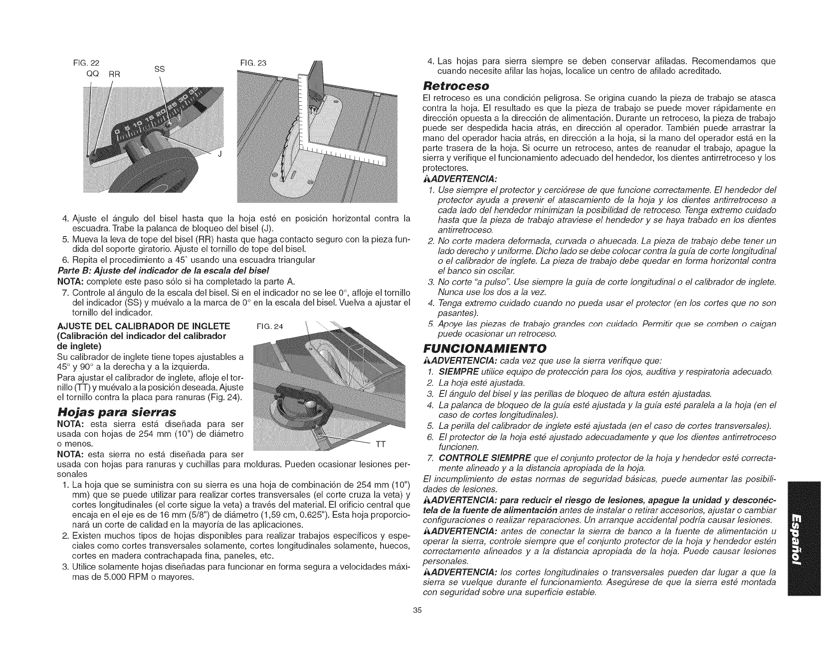 CAUTION WHEN BEVELING. USE SAW-BLADE GUARDAND SPLITTER FOREVERY OPERATION