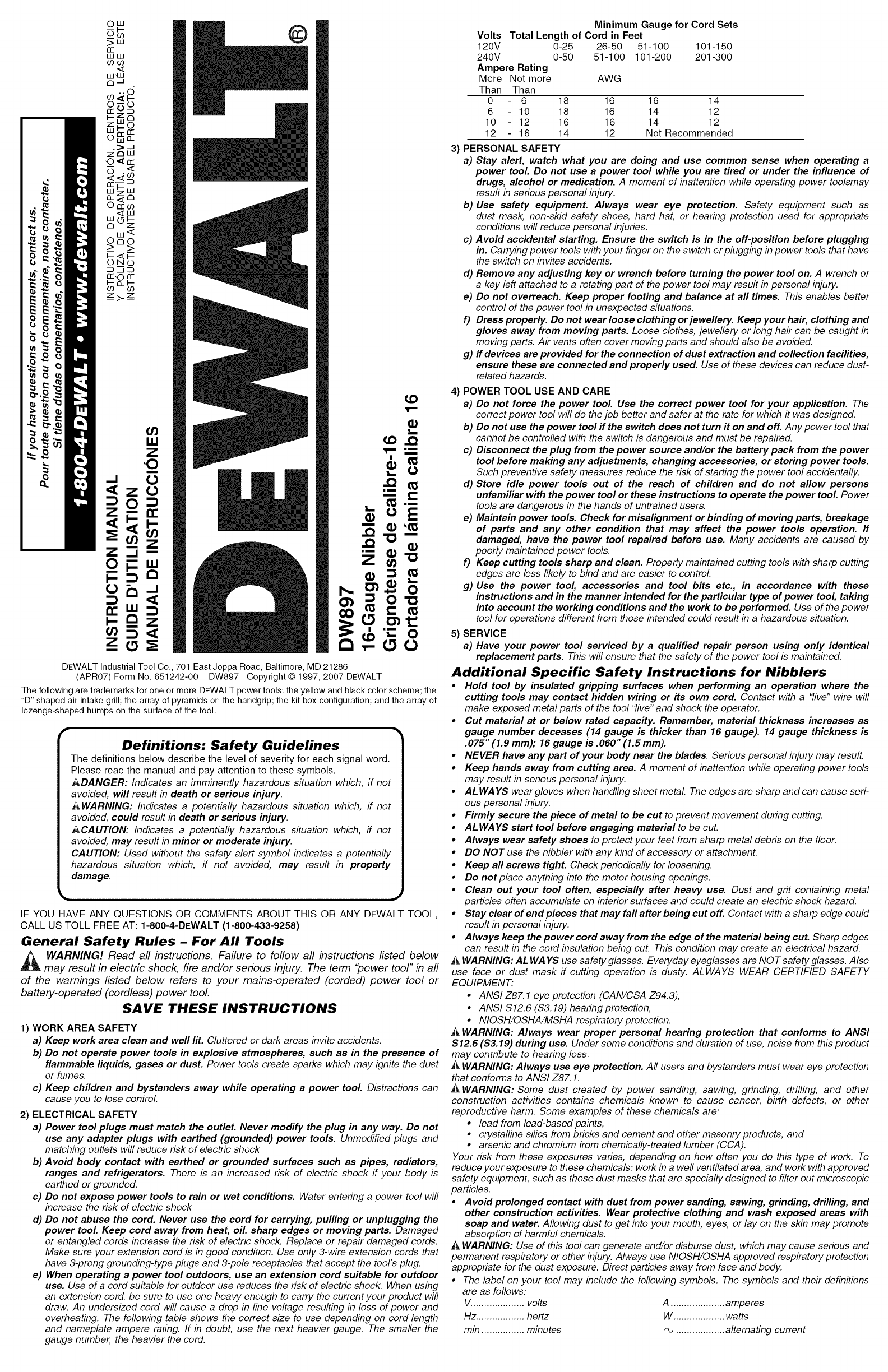 (APR07) Form No. 651242-00 DW897 Copyright © 1997, 2007 DEWALT