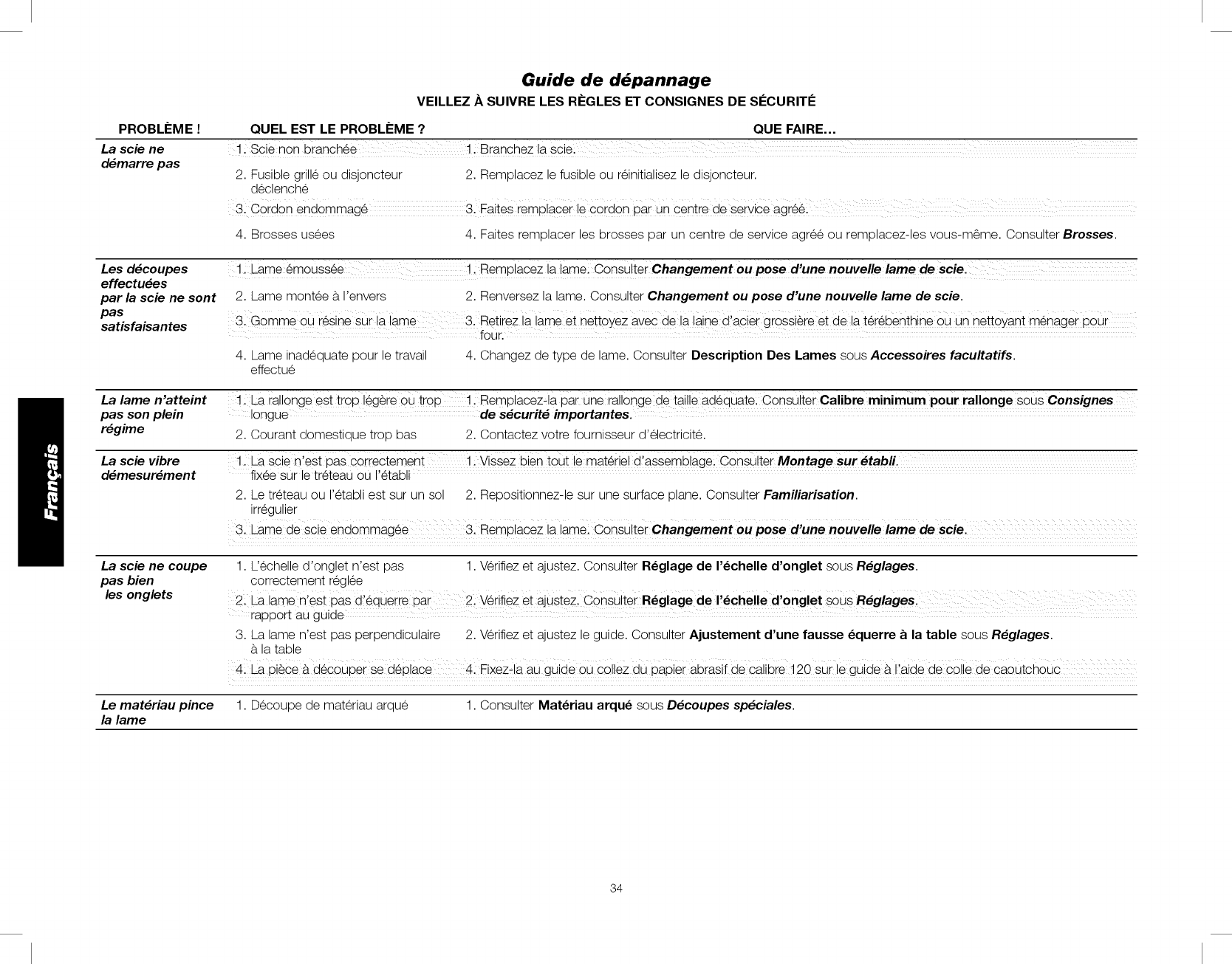 2. Hoja montada al reves 2. Vire la hoja. Consulte Cambio o instalacion de una hoja de sierra nueva.