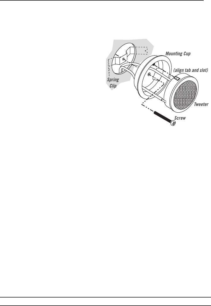 speaker wires through tweeter cup, connect tweeter to wires, and snap tweeter into cup by aligning