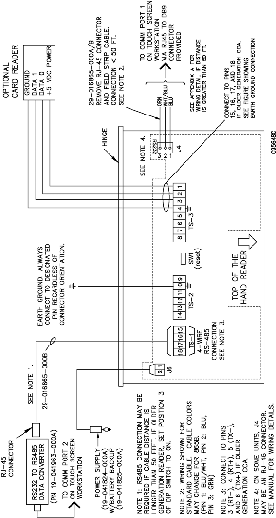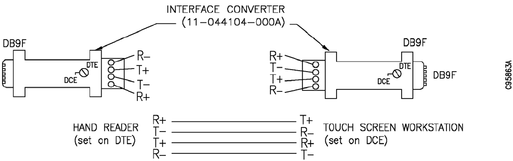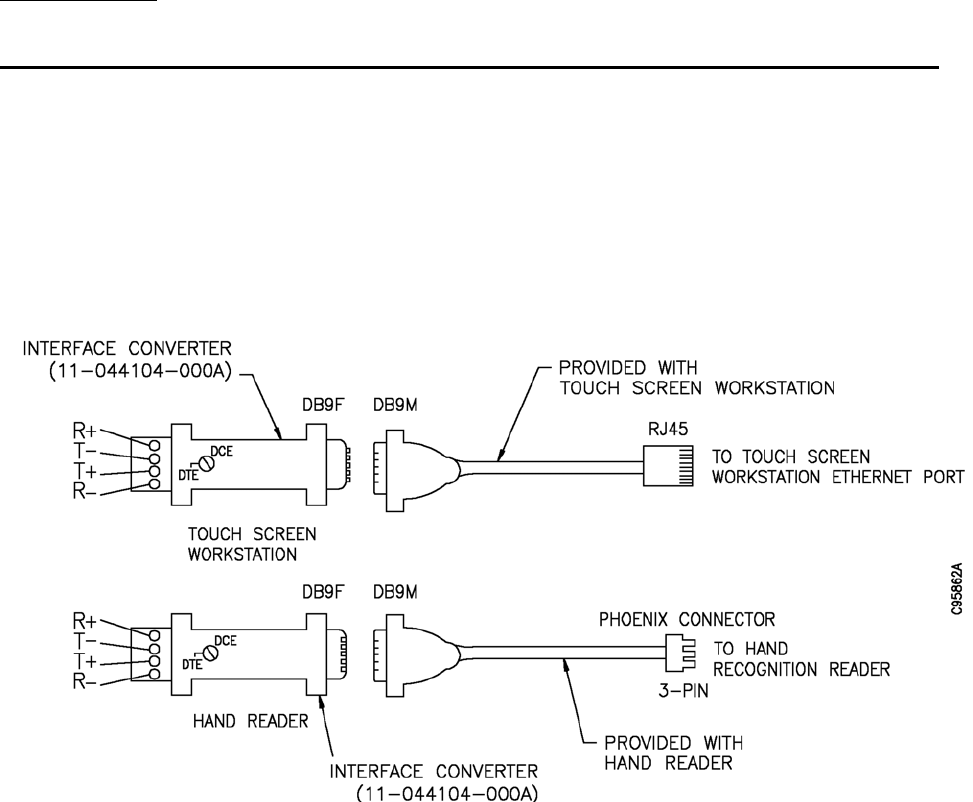 Two converters are required when distance between hand reader and touch screen workstation exceeds 50 feet.