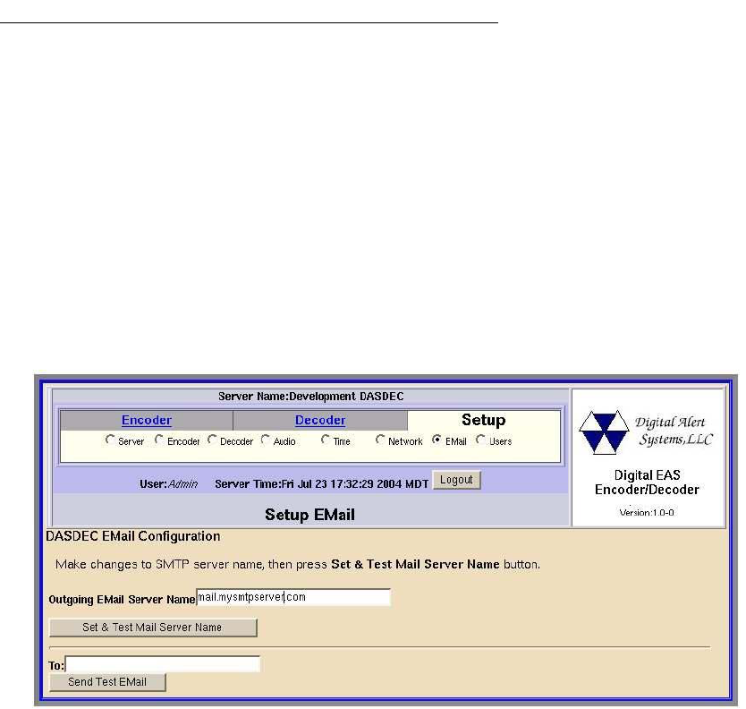 To set the outgoing email server name, enter the Setup Email page. From