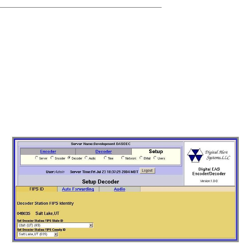 location. The Decoder Setup page has three tabbed sub-pages. The FIPS ID sub-