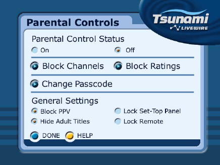 Parental Control Status: Turns parental controlled channels and rating blocks