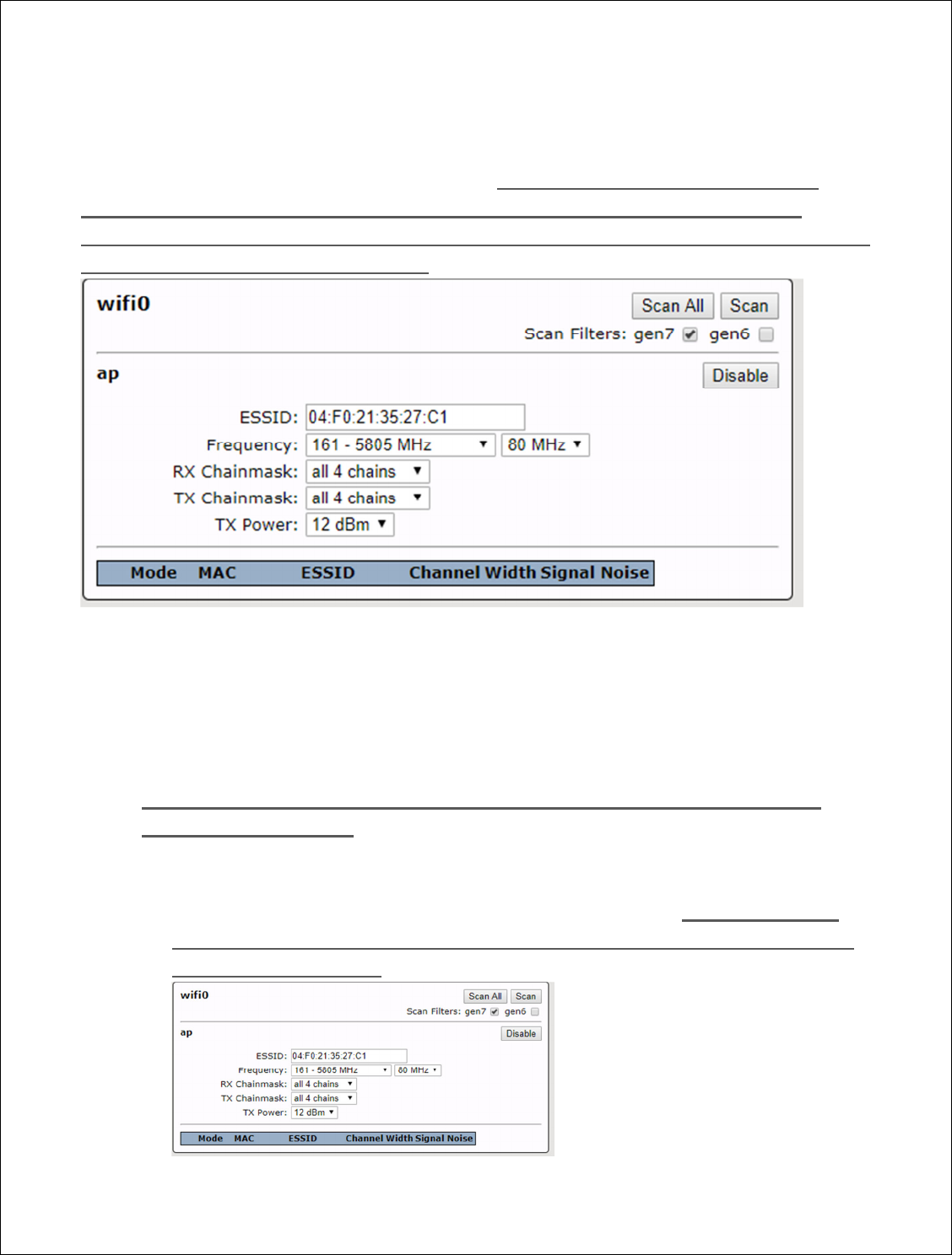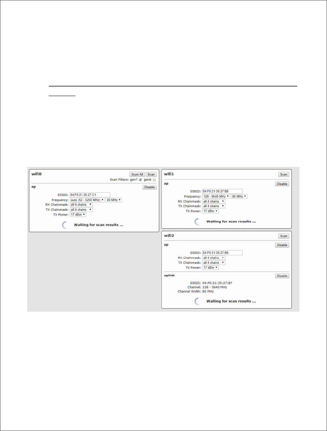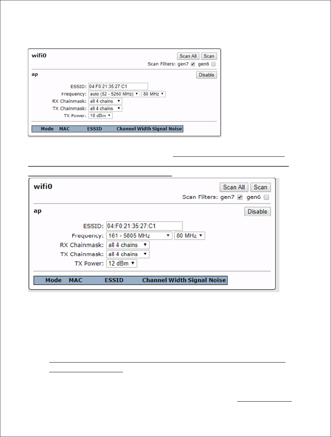 Antenna type, channel width and frequency band specified. Each each radio must be in