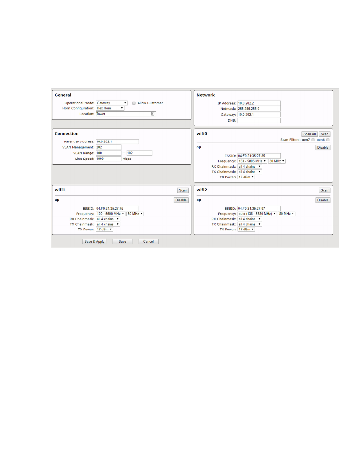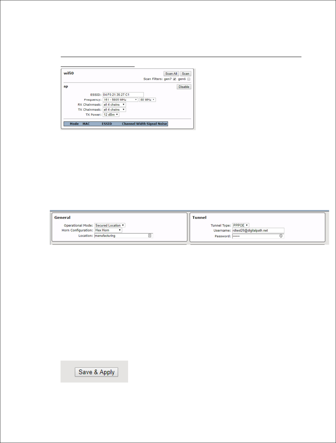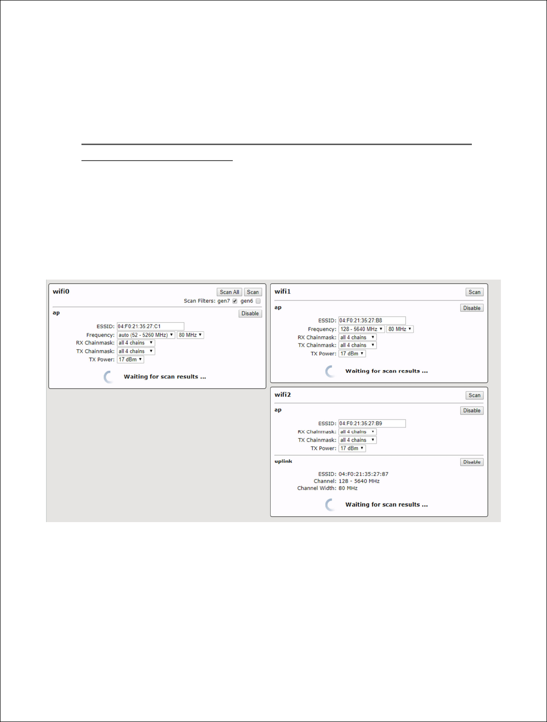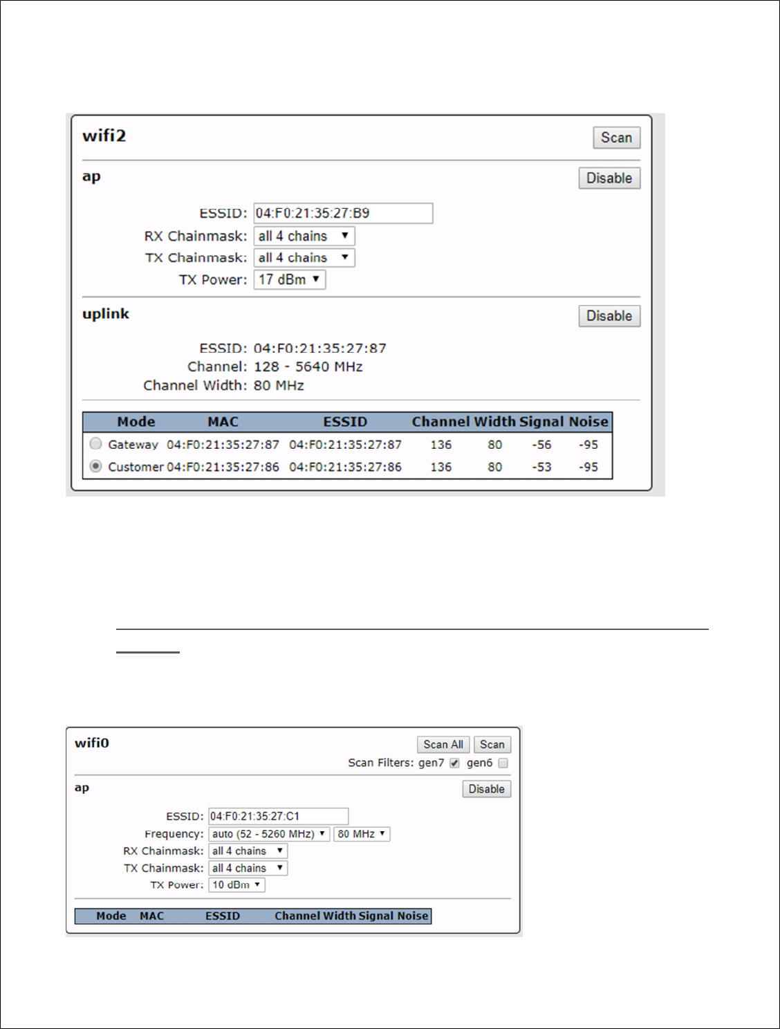 Antenna type, channel width and frequency band specified. Each each radio must be in
