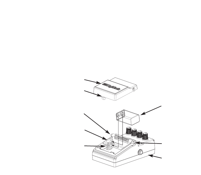 2. Begin with the effect bypassed. Press and hold the Pedal (8) and
