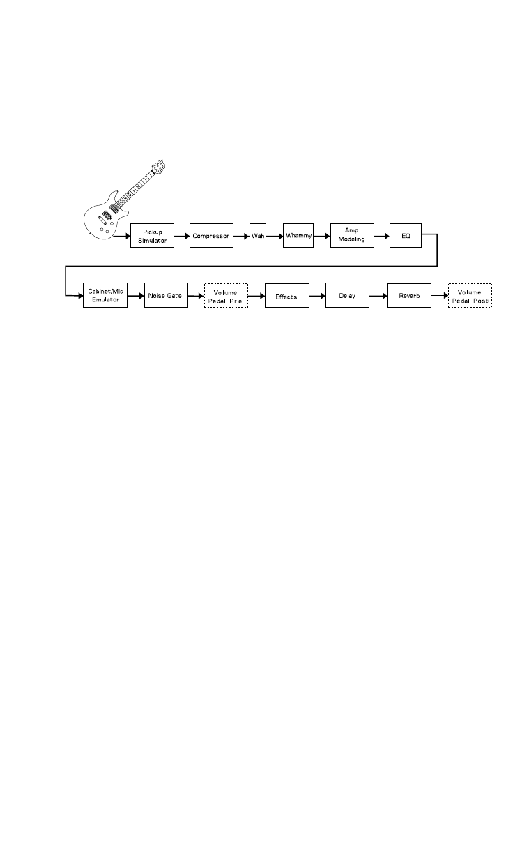 Effects: Pickup Simulator,Wah, Compressor, Amp and Acoustic Guitar Models, 3 band EQ,