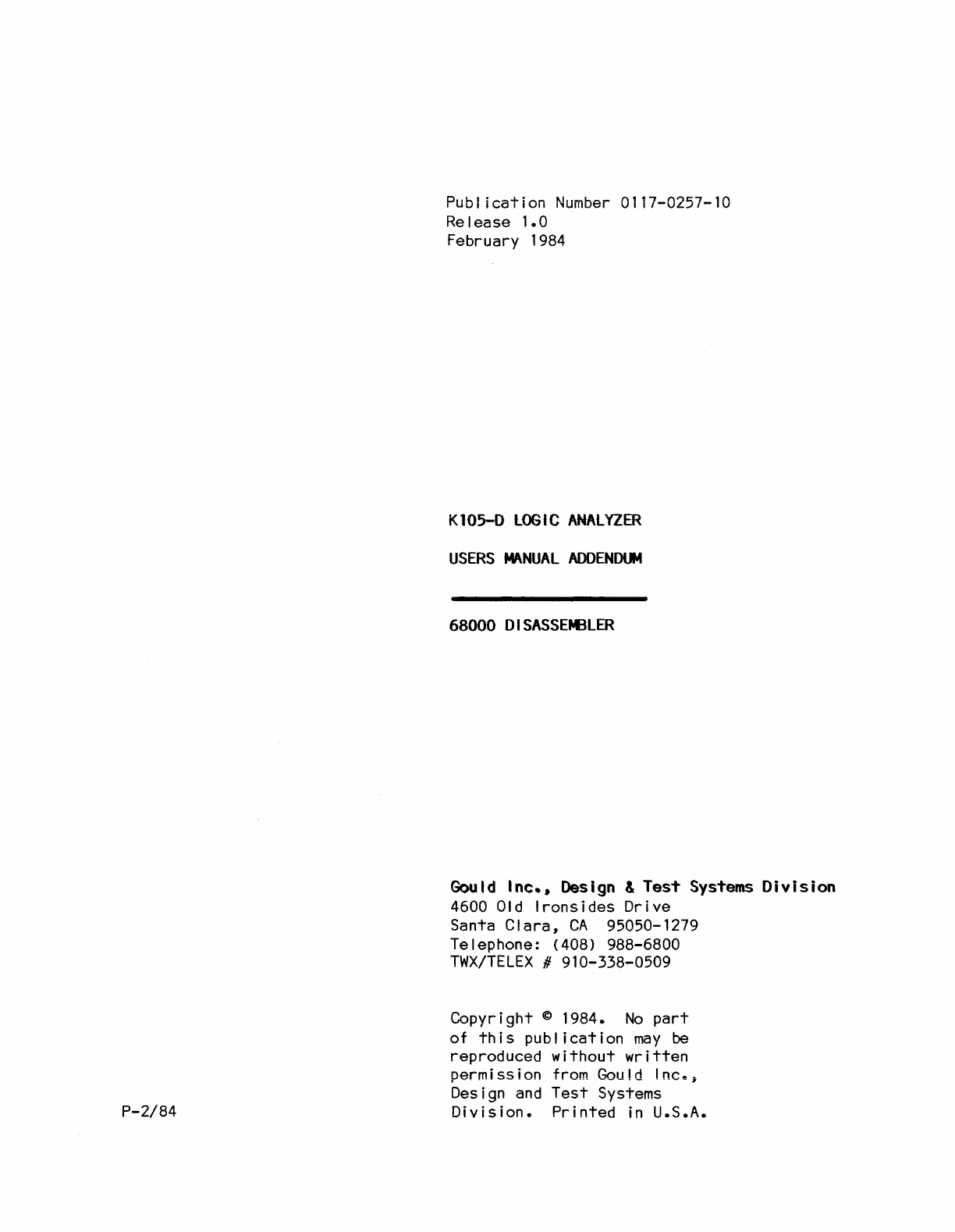 User Manual: 0117-0257-10_K105-D_Logic_Analyzer_Addendum_68000_Disassembler_Feb84