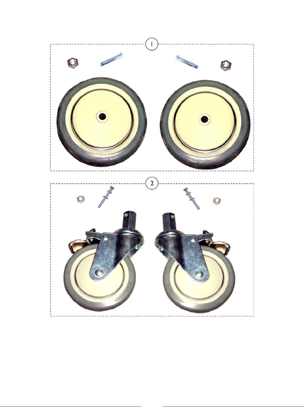 A - Kit includes: (2) Casters, (2) Pan Head Stem Bolts (10M x 16) and (2) Nylock Nuts (10mm).