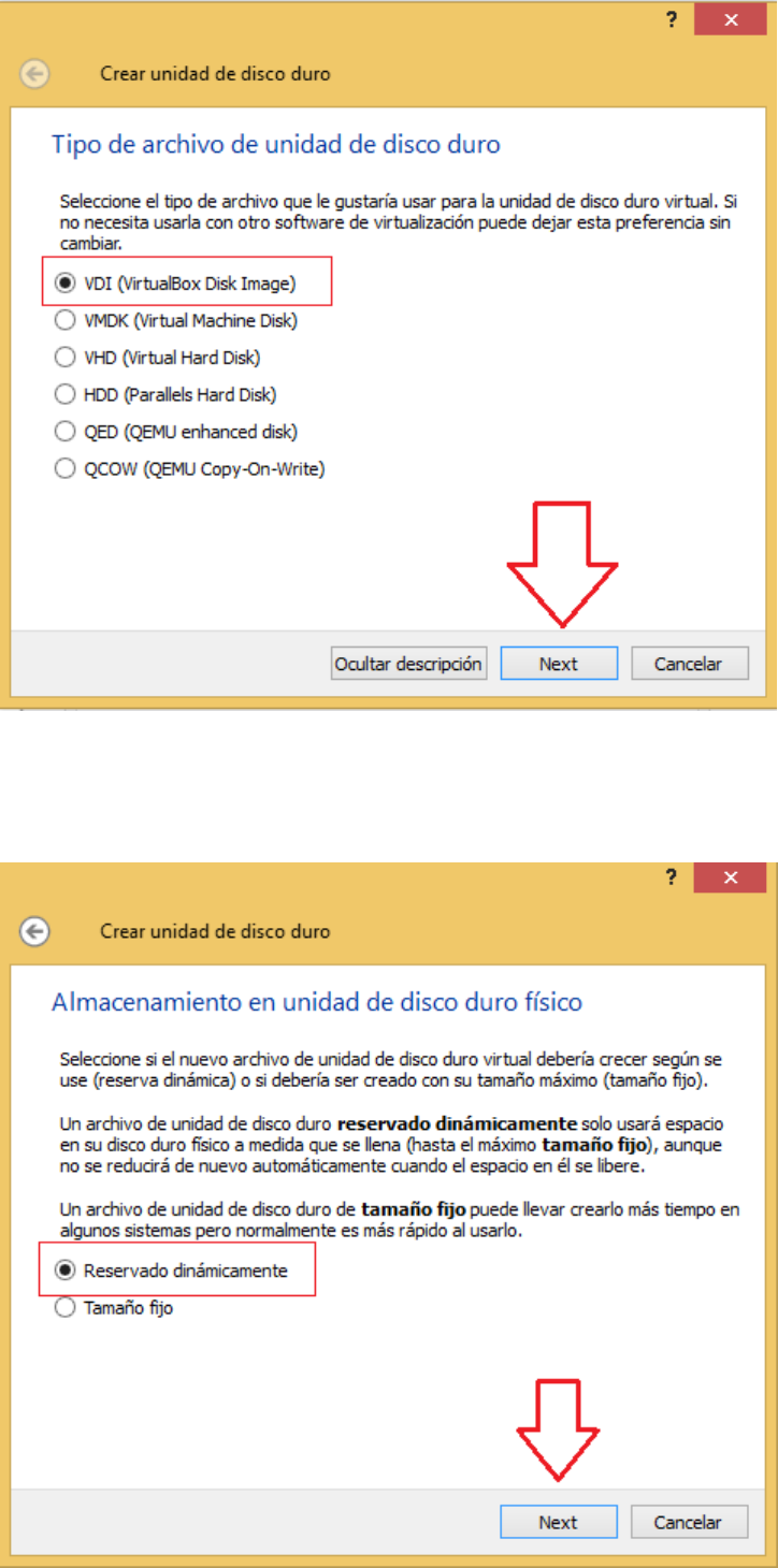 Ahora seleccionamos el tipo de archivo que vamos a utilizar para la creación del disco duro así