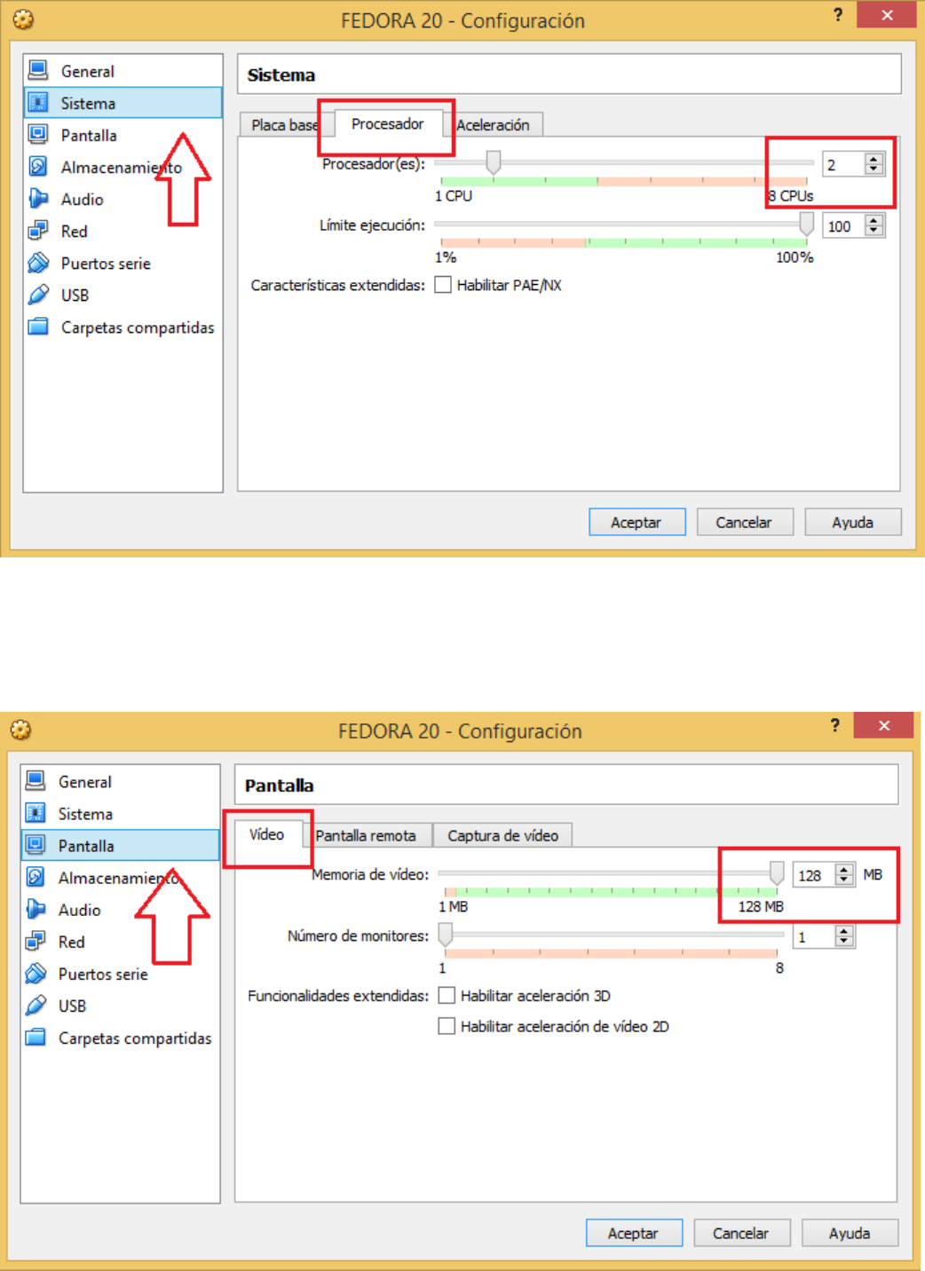 7. Ahora vamos y damos clic en la opción pantalla en la pestaña video y asignamos 128mb de