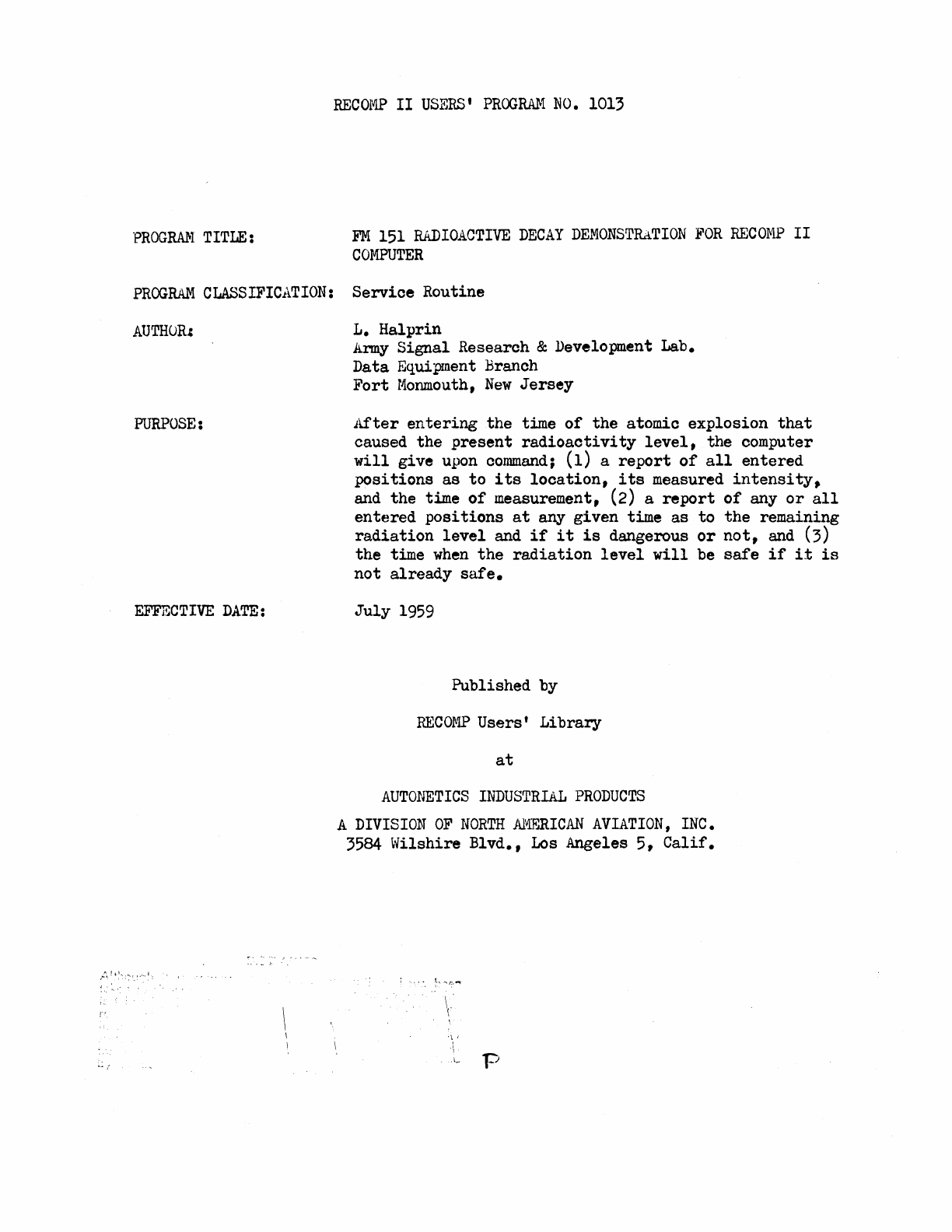 User Manual: 1013_FM_151_Radioactive_Decay_Demonstration_for_Recomp_II_Computer_Jul59