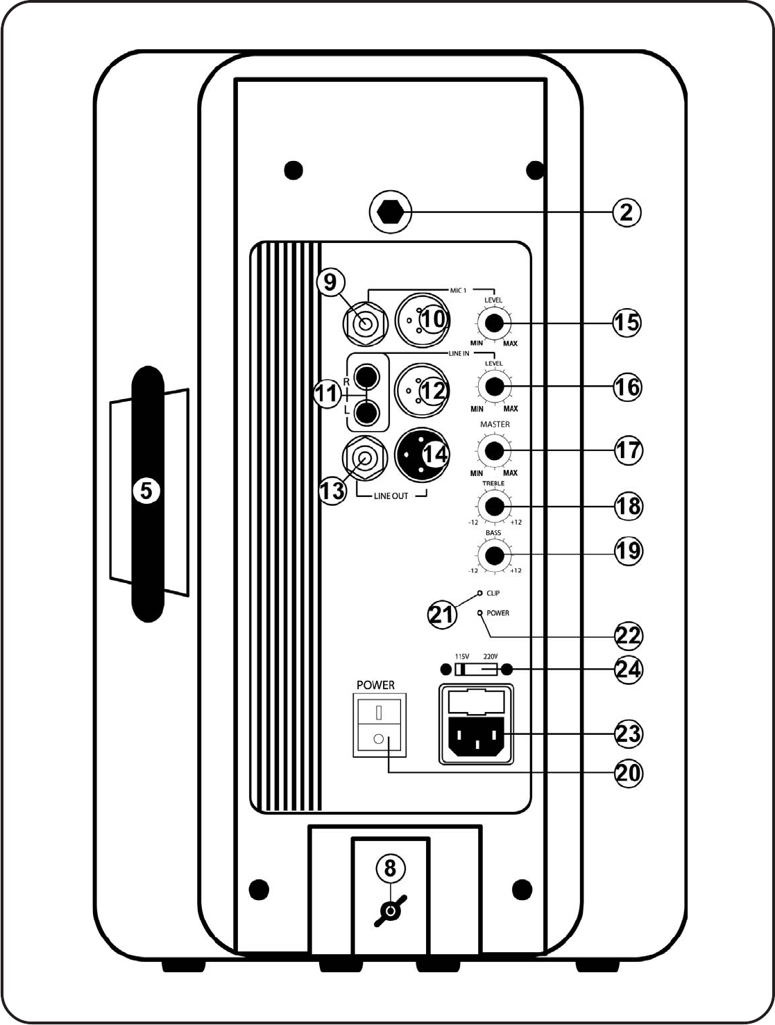 commandes d’input/master/bass/treble, 1/4" et XLR entrées de mic, Ligne entrées de RCA et