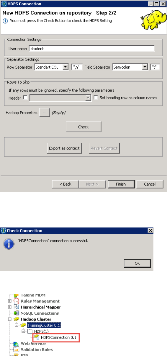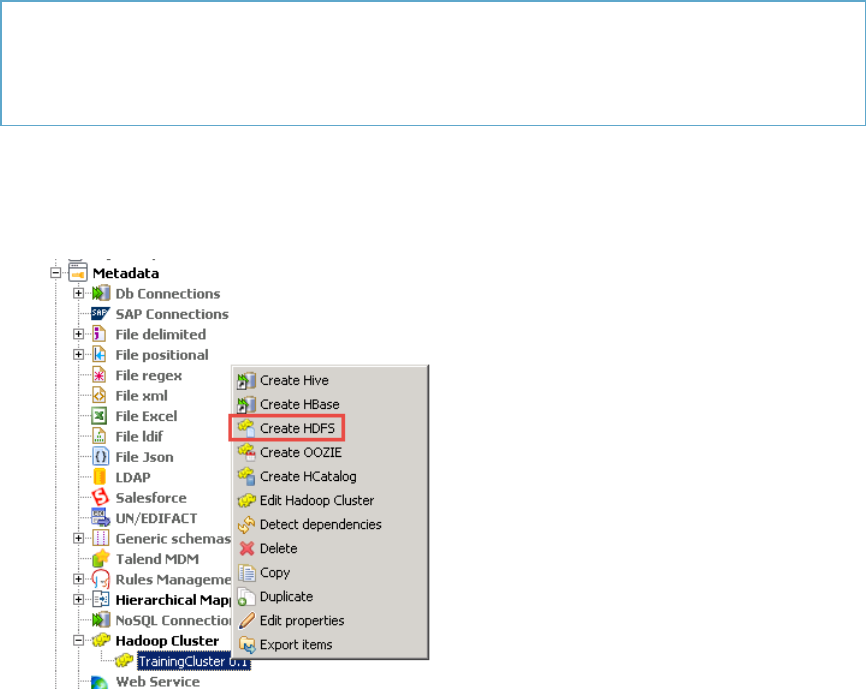 a. In the Repository, under Metadata/Hadoop Cluster/TrainingCluster/HDFS, click HDFSConnection and drag it