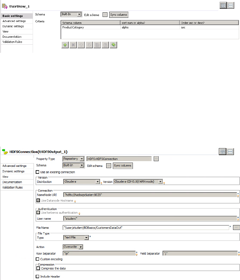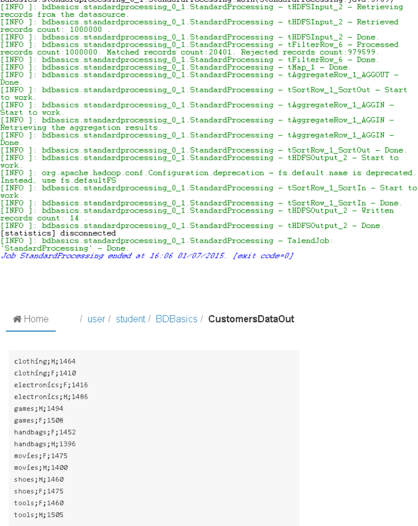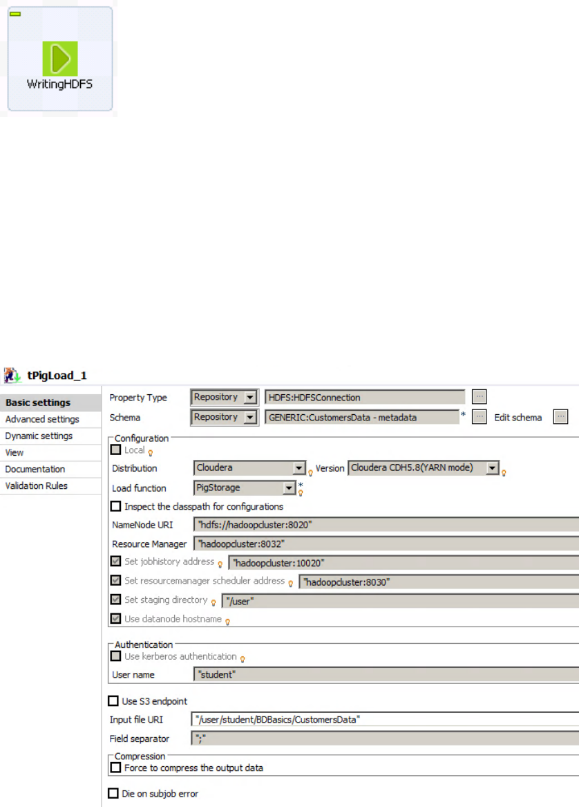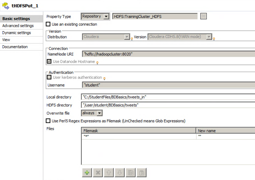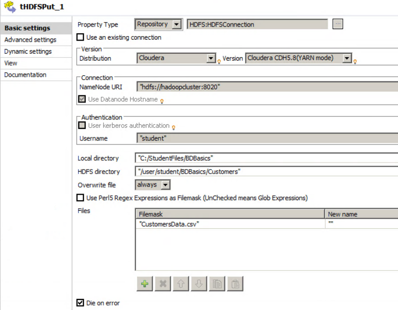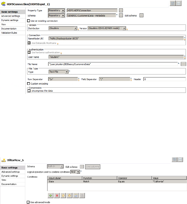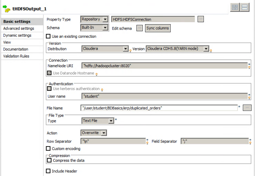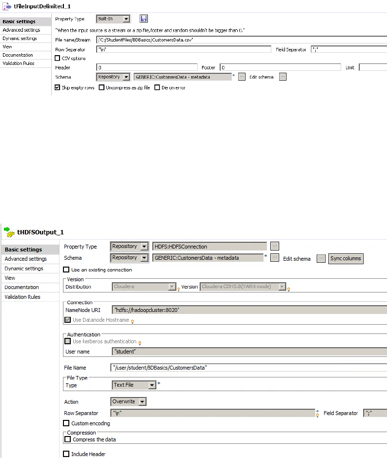 Configure tHDFSOutput to write the results in the /user/student/BDBasics/CustomersDataOut_MR folder.