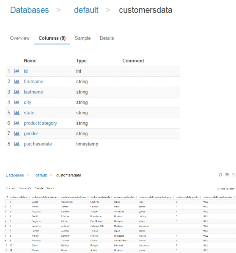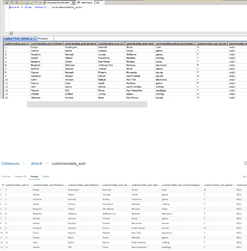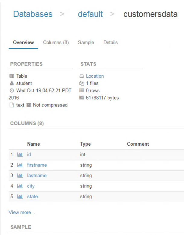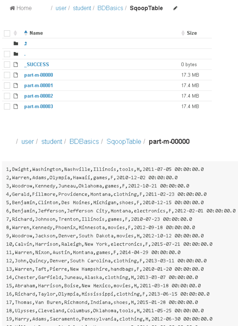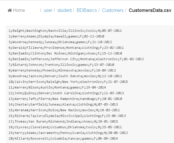In Hue, using the File Browser, navigate to /user/student/BDBasics and open CustomersDataOut: