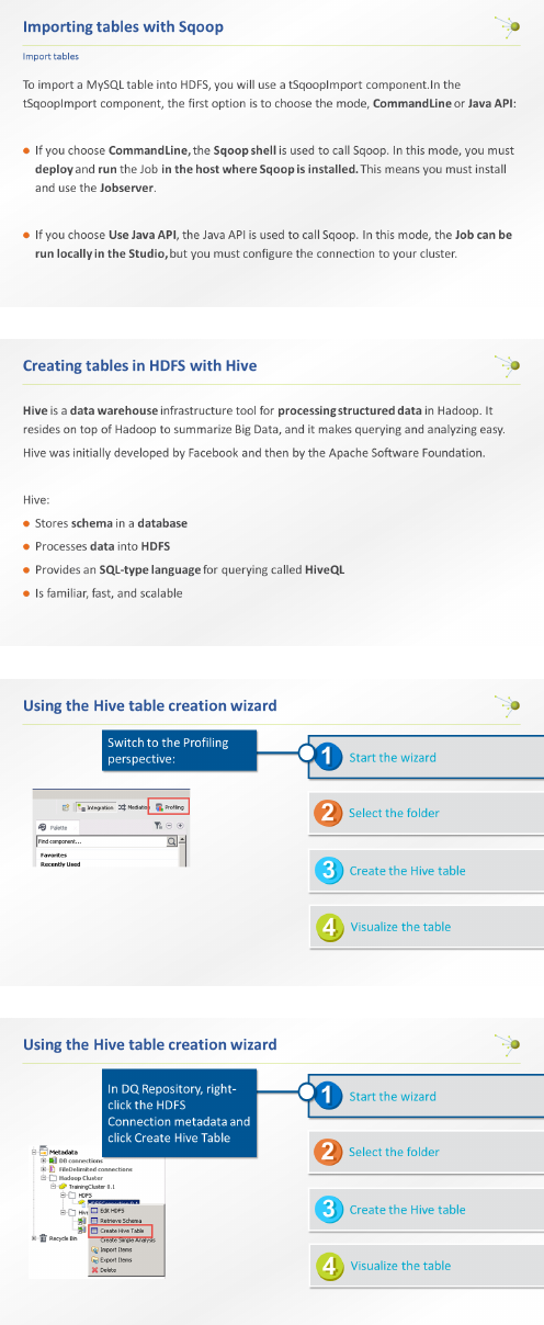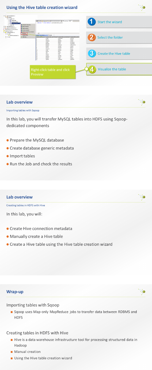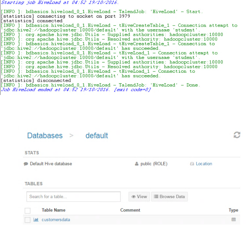The first part of the chapter was dedicated to Hive Tables. You built a Job to extract data of interest in your Hive table with a tHiveIn-