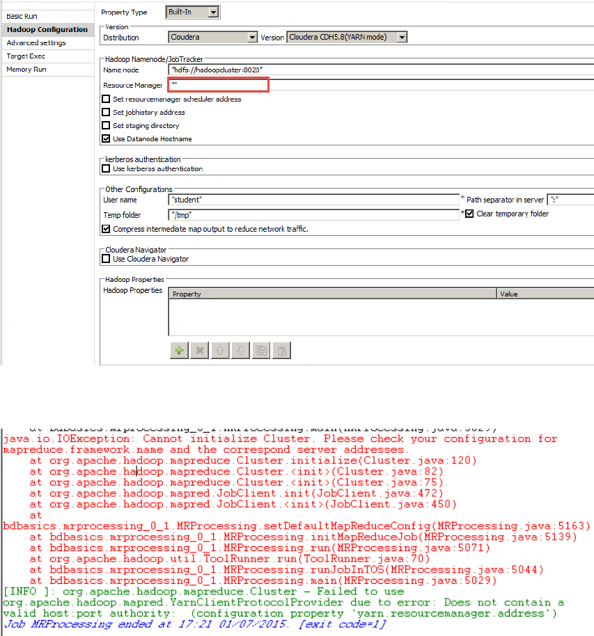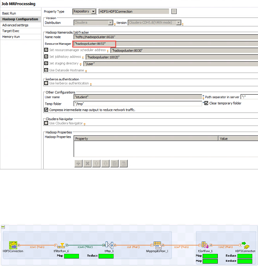 To fix this, you can either use your TrainingCluster metadata, or set the Resource Managerto "hadoopcluster:8032":