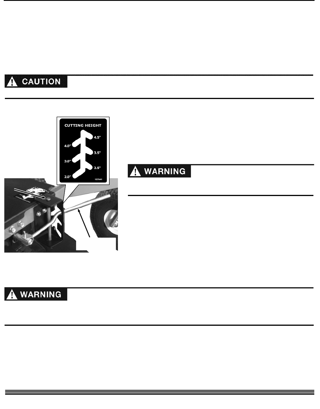 • Be sure all Blade and Wheel controls are disengaged before attempting to start the Engine. Engage and disengage the Mower