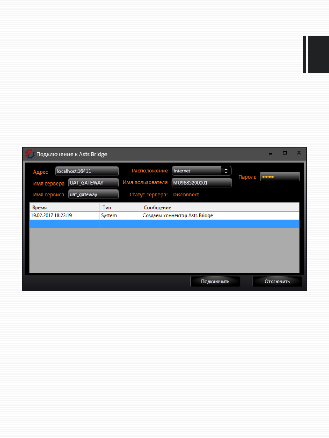 Стандартно выбираем сервер ASTS Birdge в выборе серверов доступа и в настройках