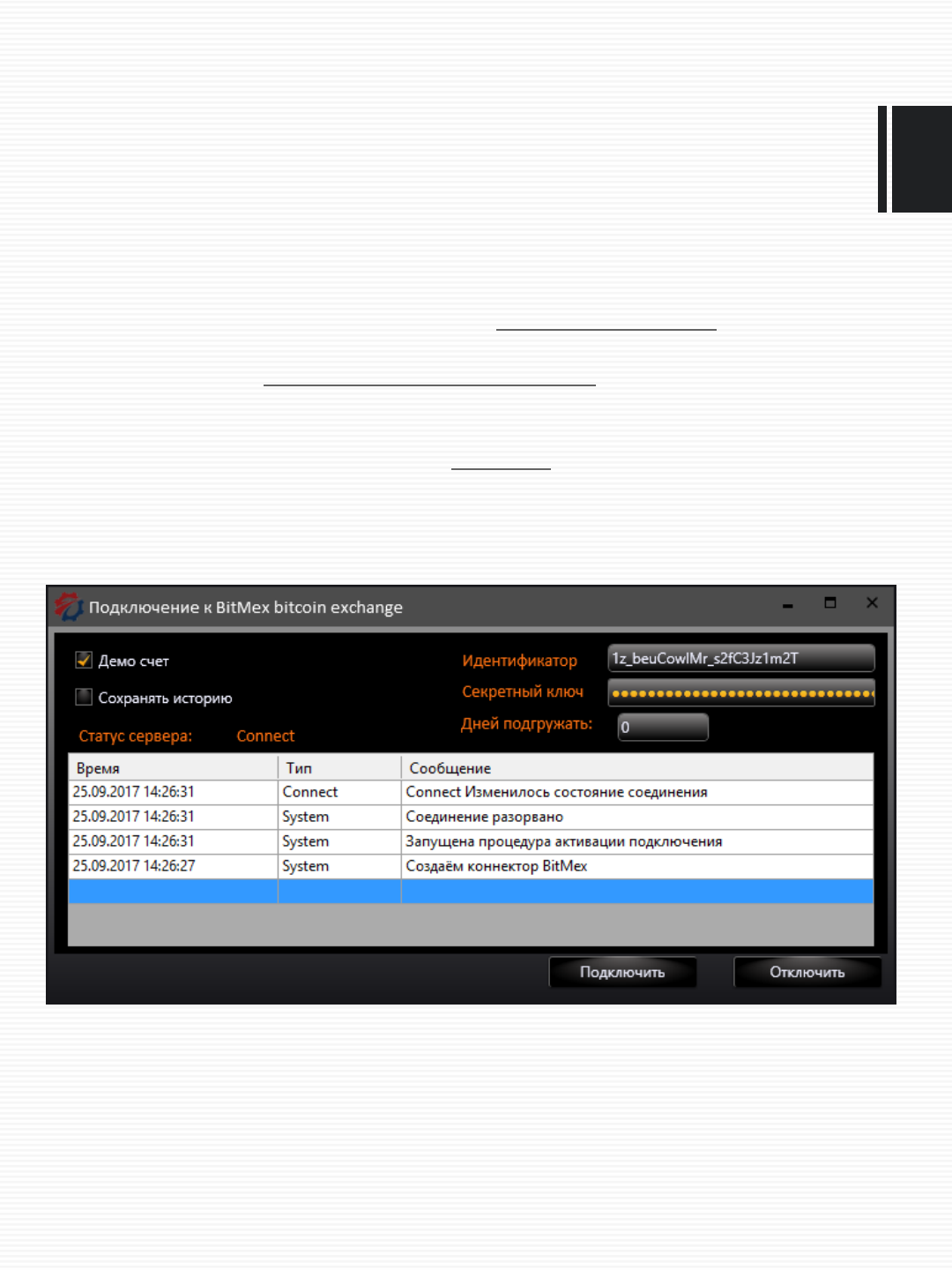 У данной биржи криптоВалют нет учебного подключения и здесь описан боевой способ