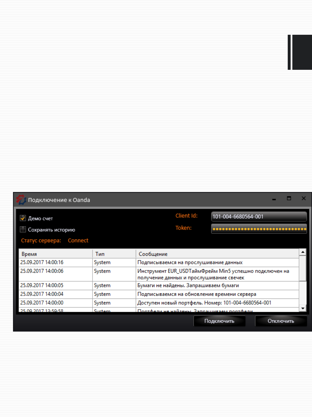 Далее идём в OsEngine и выбираем в подключениях Oanda: