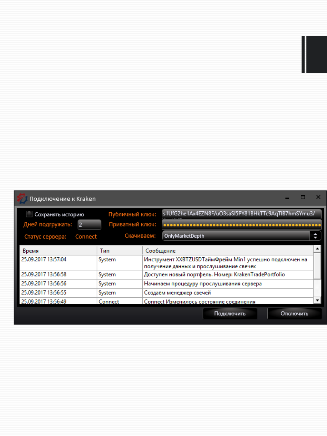 Вбиваем ключи в OsEngine подключении к Kraken и жмём «Подключить»