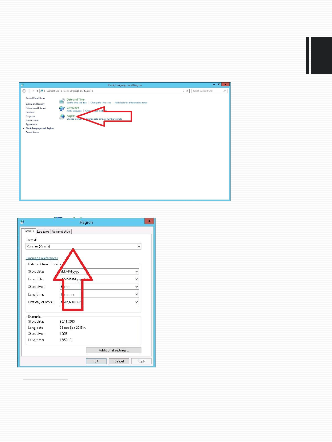 после этого выбираем настройки региона: