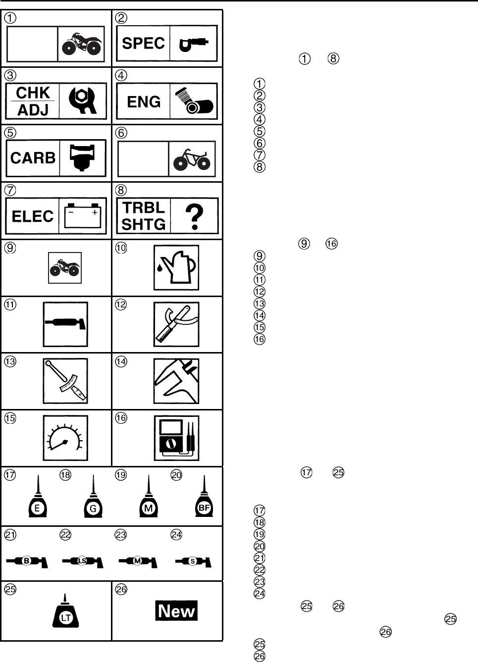 This manual consists of chapters for the main categories of subjects. (See “symbols”)