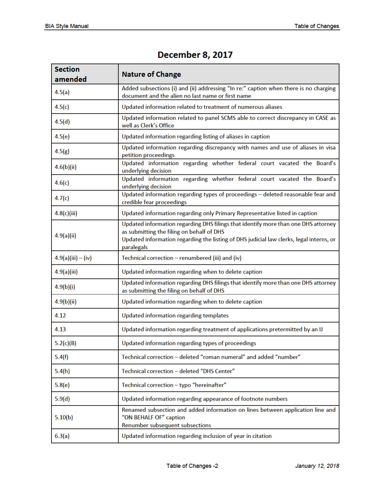 Table of Changes