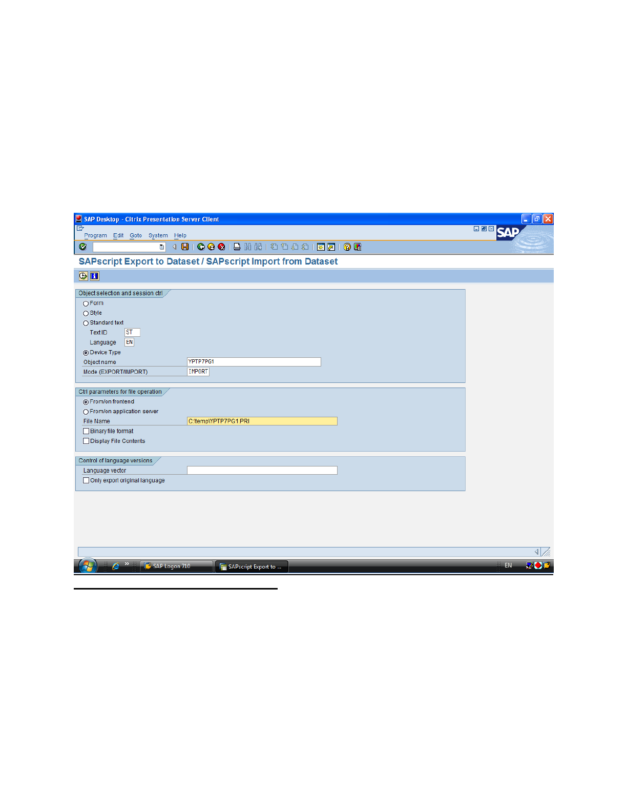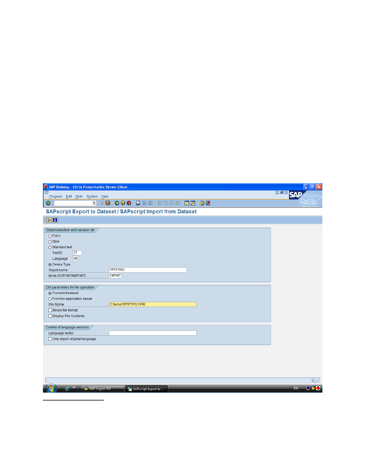 3) At the “SAPscript Export to Dataset / SAPscript Import from Dataset” screen: