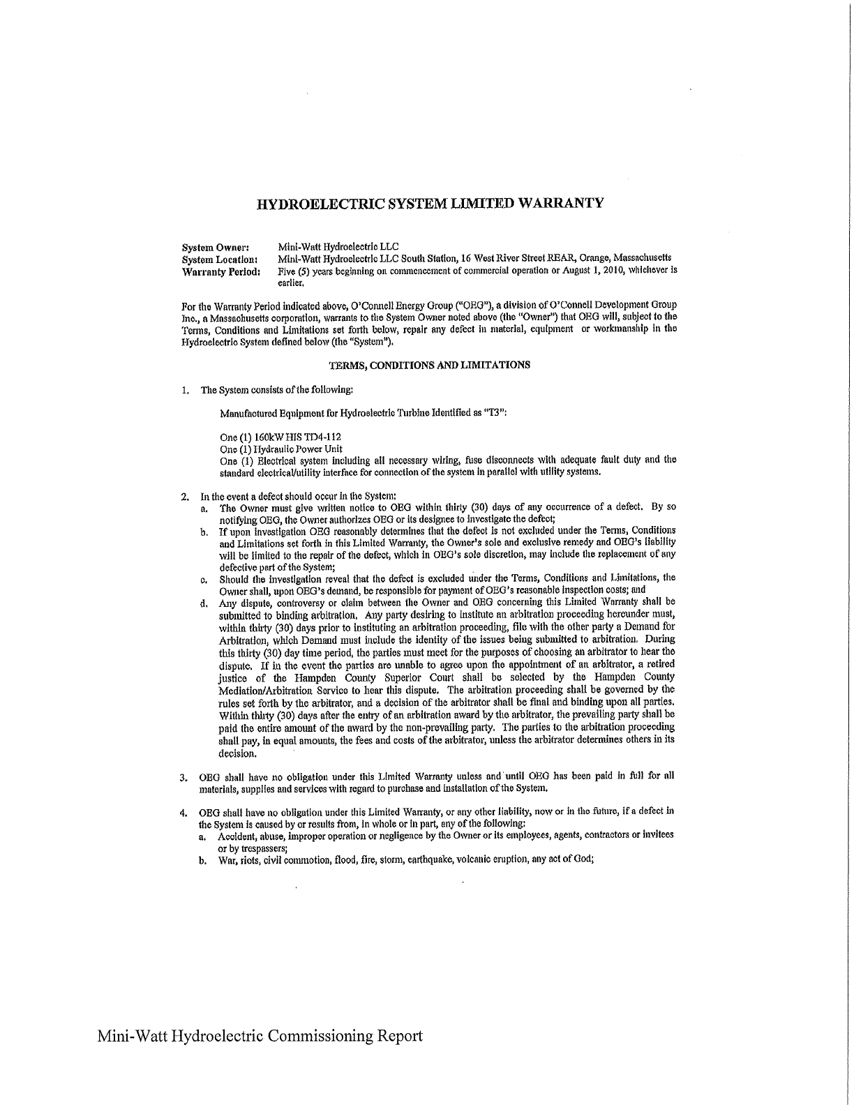 Hydroelectric’s (“Mini-Watt”) 160 kW turbine generator 3 (“T3”) located in Orange,