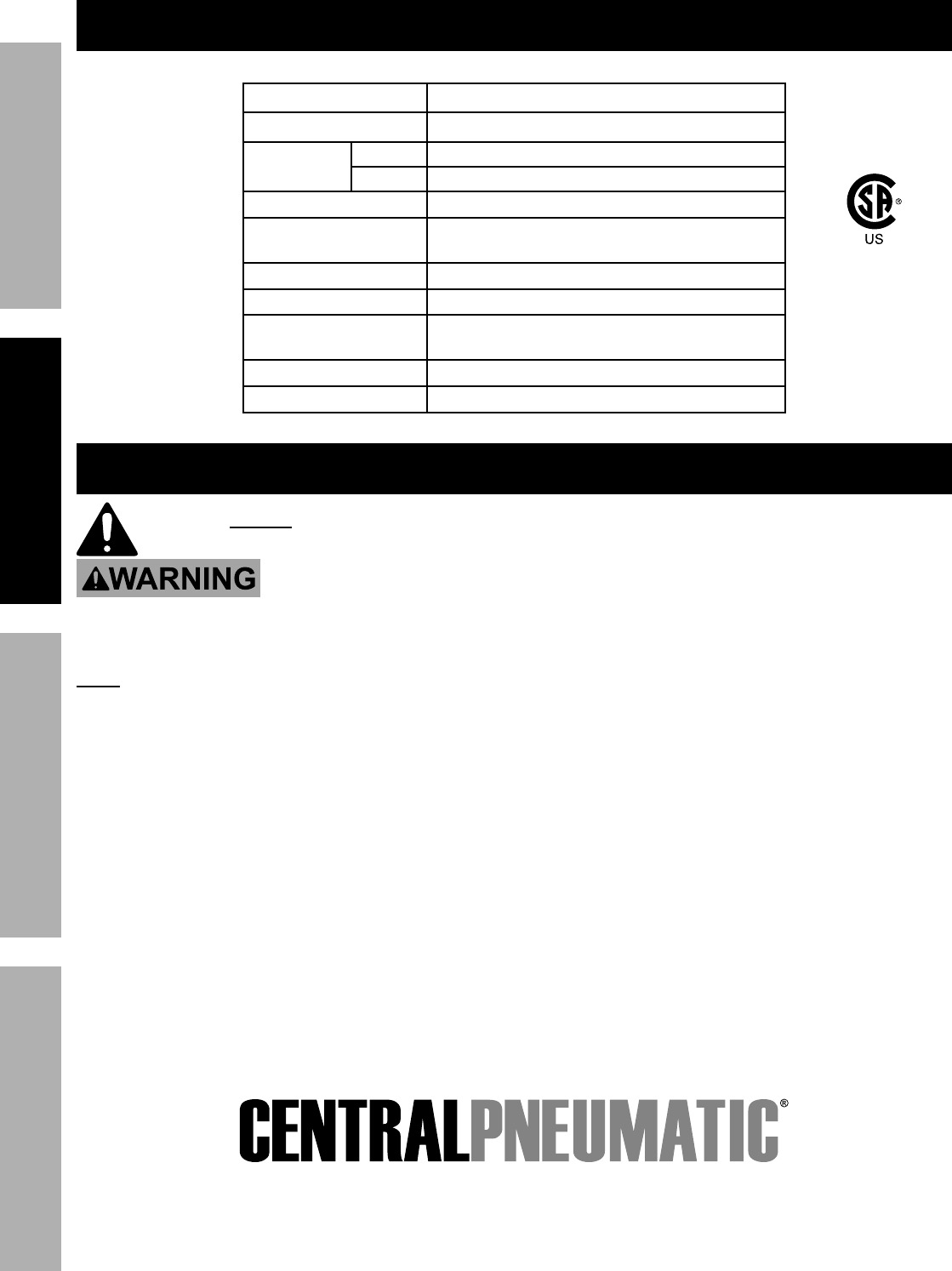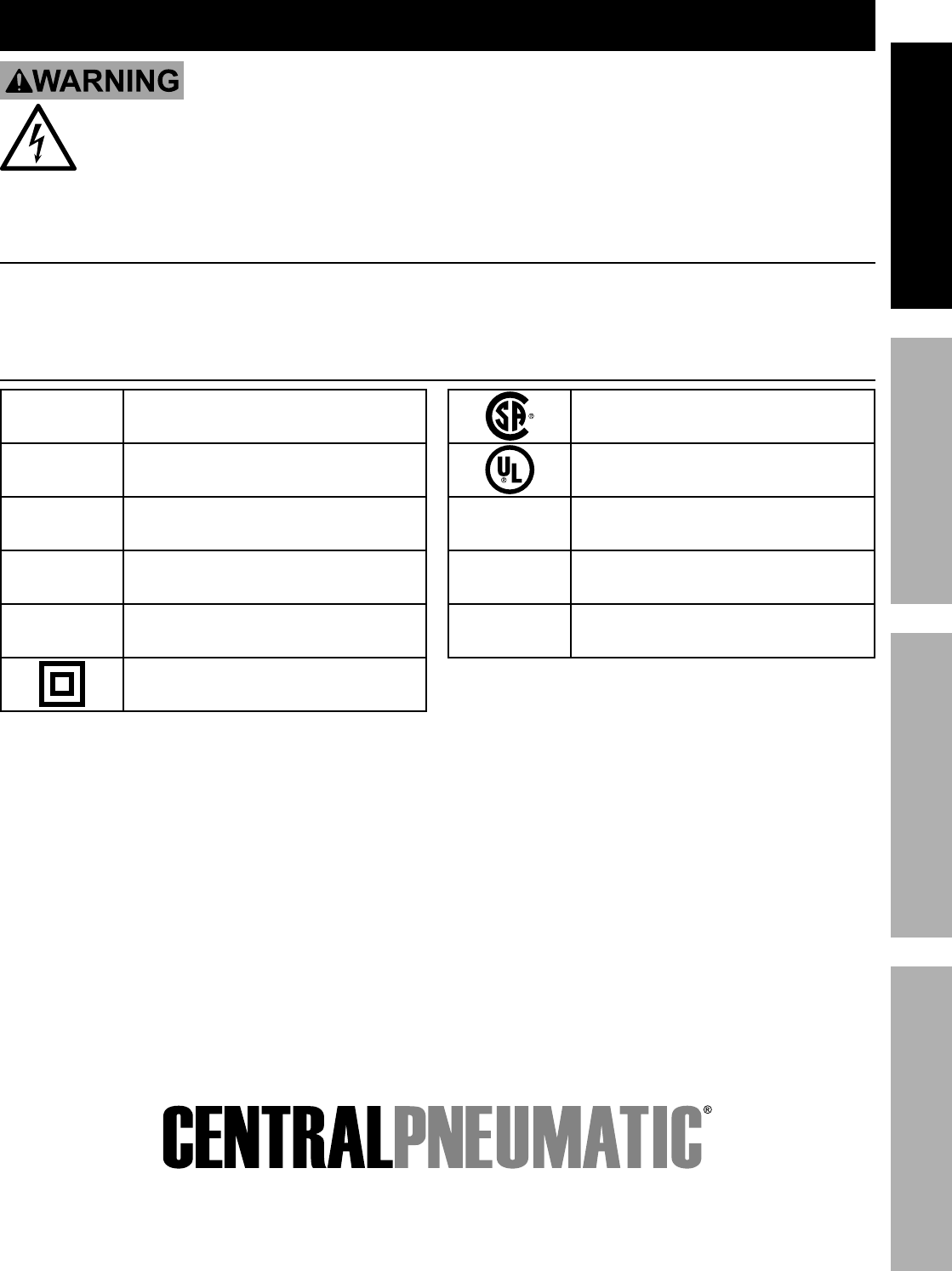 User Manual: Manual for the 62299 60 gal. 5 HP 165 PSI Two Stage Air Compressor 60 gal. 5 HP 165 PSI Two Stage Air Compressor