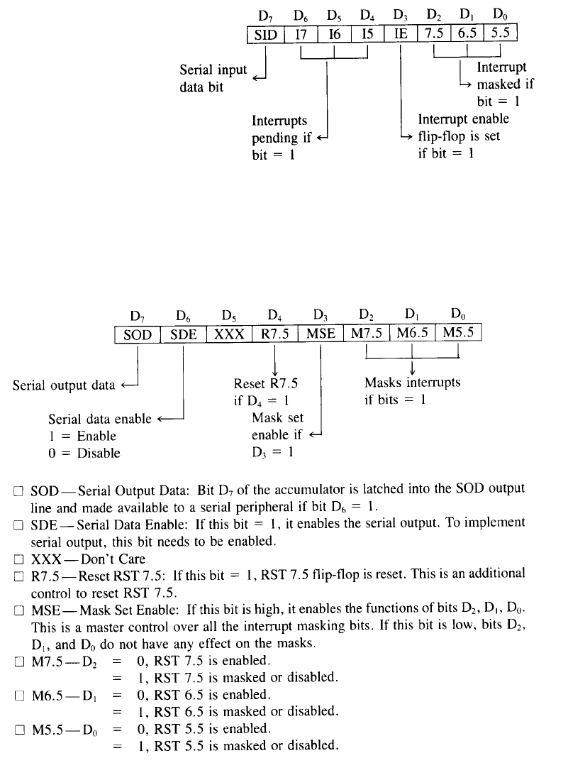 interrupts 7.5, 6.5, 5.5 and read serial data input bit. The