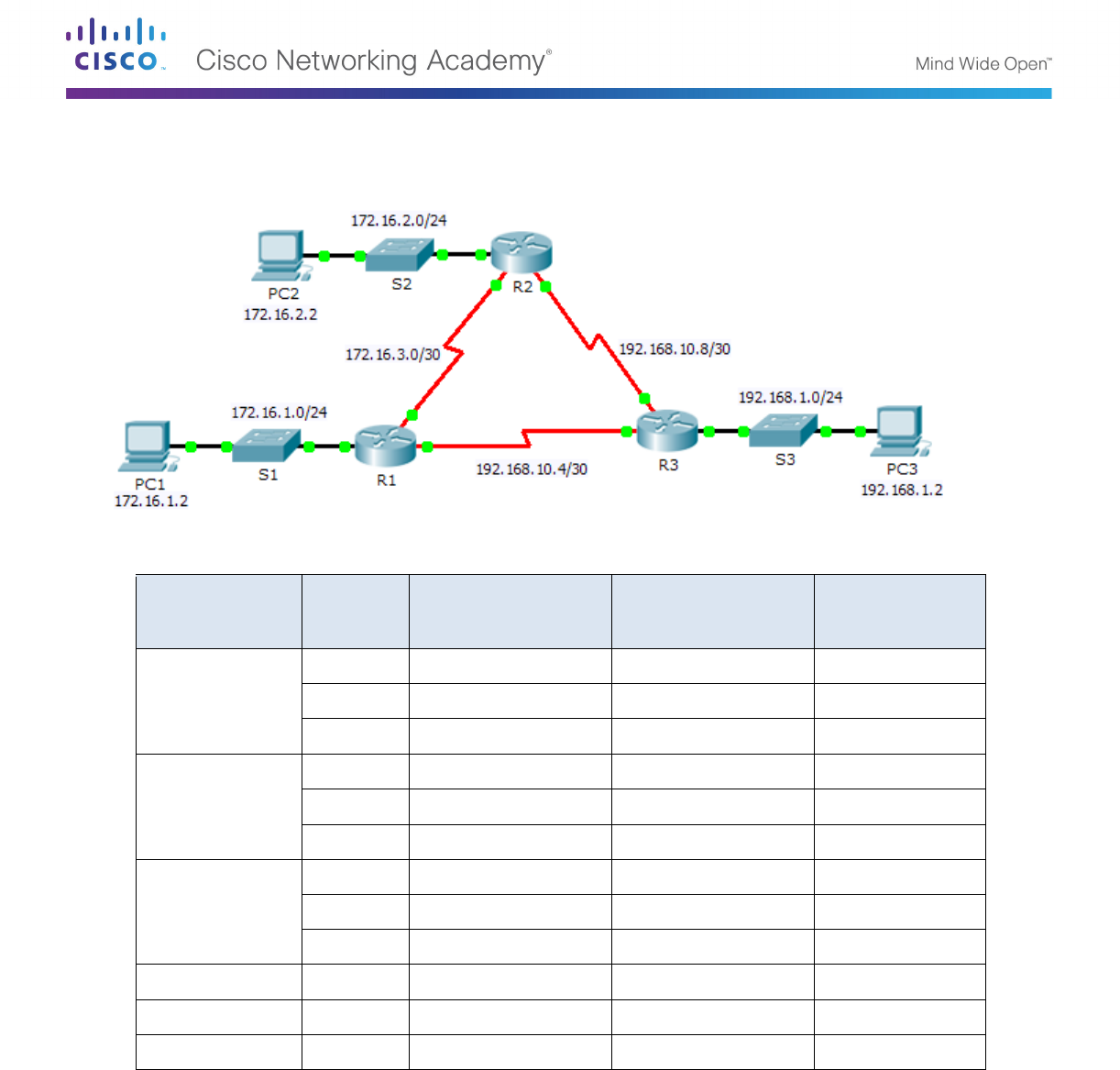 En cada router, la tabla de routing ahora debe tener una ruta a cada red de la topología.