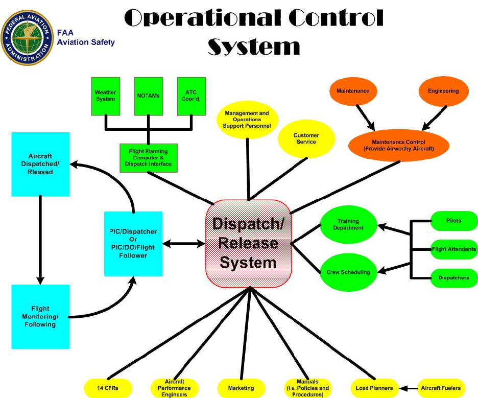 - 6. INTRODUCTION. System safety, as it applies to operational control, includes identification, analysis, assessment, and control of hazards and risks (refer to current editions of FAA Order 8040.4, Safety Risk Management, and AC 12092, Introduction to Safety Management Systems for Air Operators). An effective system safety approach to certificate management should include an analysis of the capabilities of an air carrier to safely maintain operational control of its aircraft. The air carrier’s operating manual must include procedures for coordinated dispatch, flight control, or flight following procedures (refer to § 121.135(b)(4)). These procedures should enhance operational control and prevent interference with the decisionmaking process. Business objectives must not override safety concerns of the PIC, aircraft dispatcher, or Director of Operations (DO) (or his designee), who share legal responsibility for the flight, as appropriate.