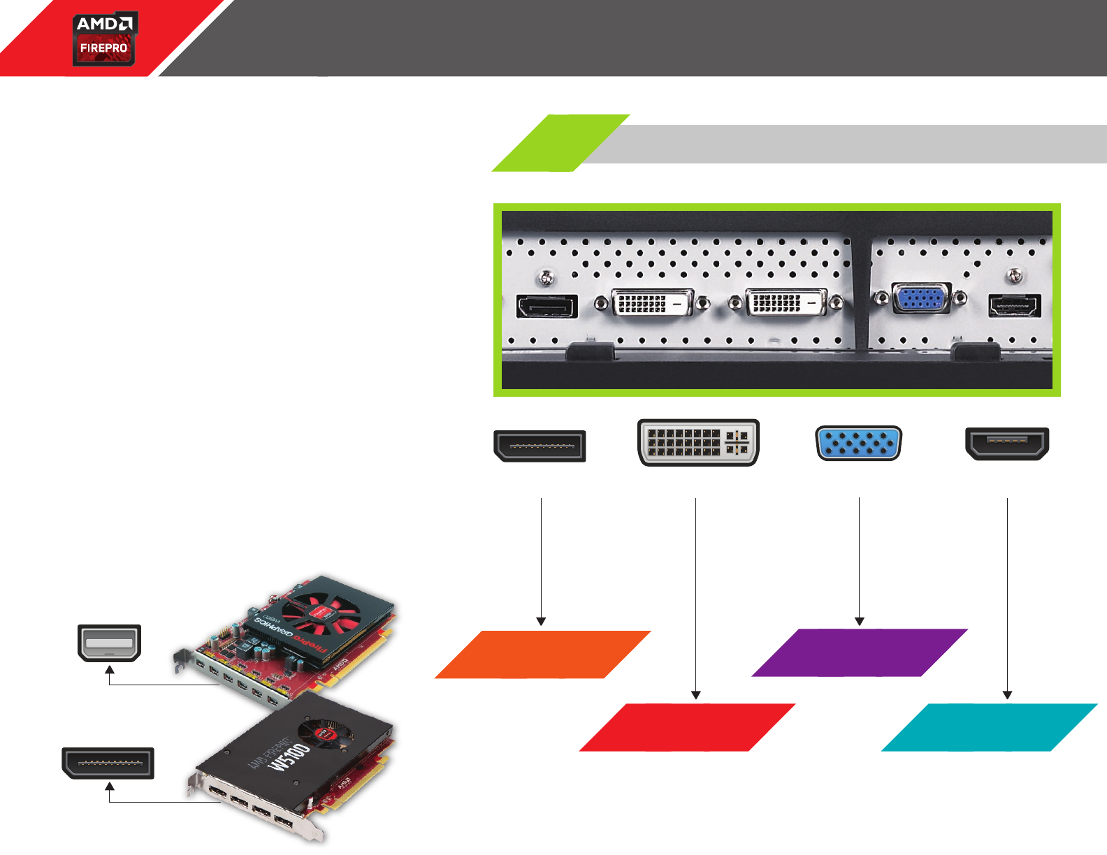 1 AMD Eyefinity technology supports up to six DisplayPort monitors on an enabled graphics card. Supported display quantity, type and resolution vary by model and board design. Mixed monitors of different resolutions are supported by select AMD FirePro™ professional graphics cards. Confirm specifications with manufacturer