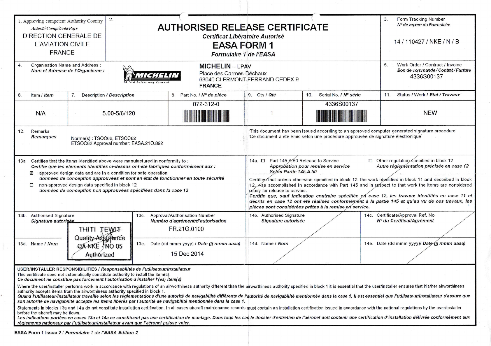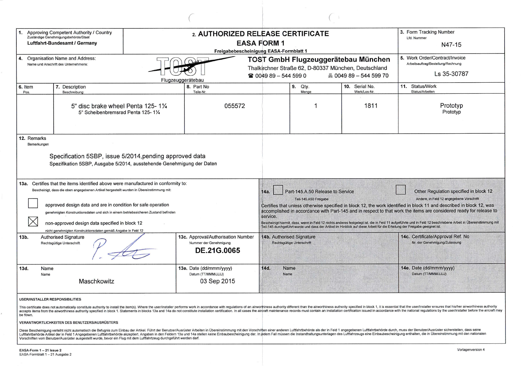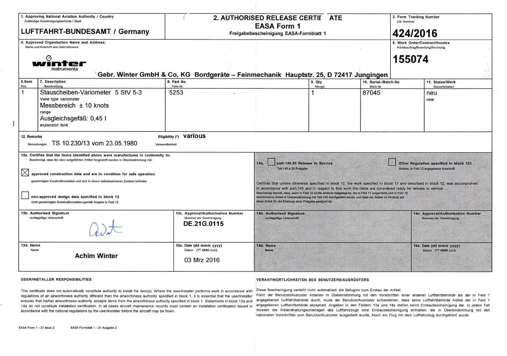 angegebenen Luftfahrtbehorde akzeptiert. Angaben in den Feldern 13a und 14a stellen keine Einbaubescheinigung dar ln jedem Fali