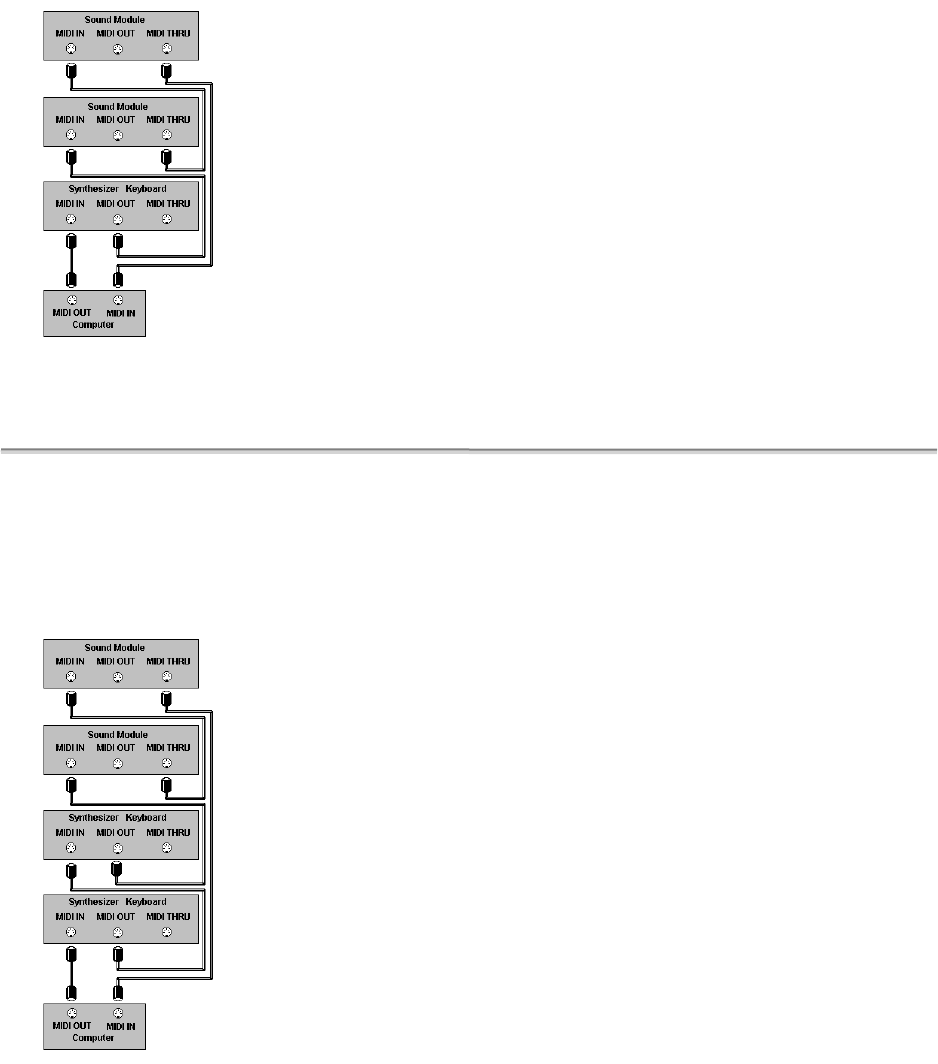 from the first synthesizer's MIDI THRU port to the next Sound Module's synthesizer's MIDI IN port,